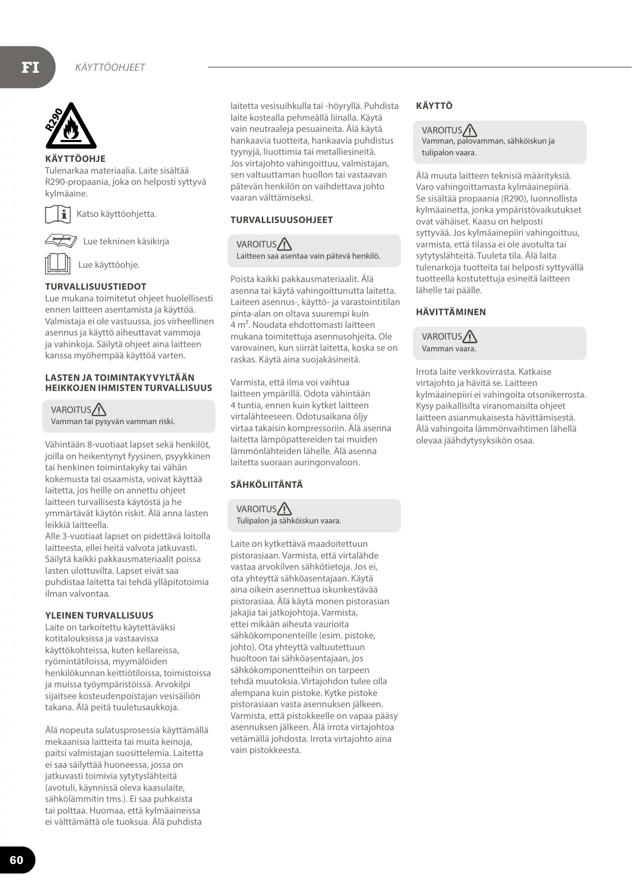 VAROITUS/\ Vamman tai pysyvän vamman riski. Vähintään 8-vuotiaat lapset sekä henkilôt, joilla on heikentynyt fyysinen, psyykkinen tai henkinen toimintakyky tai vähän kokemusta tai osaamista, voivat käyttäà laitetta, jos heille on annettu ohjeet laitteen turvallisesta käytôstä ja he ymmärtävät käytôn riskit. là anna lasten leikkiä laitteella. Alle 3-vuotiaat lapset on pidettävä loitolla laitteesta, ellei heitä valvota jatkuvasti. Säilytä kaikki pakkausmateriaalit poissa lasten ulottuvilta. Lapset eivät sa puhdistaa laitetta tai tehdà ylläpitotoimia ilman valvontaa. YLEINEN TURVALLISUUS Laite on tarkoitettu käytettäväksi kotitalouksissa ja vastaavissa käyttôkohteissa, kuten kellareissa, ryômintätiloissa, myymälôiden henkilôkunnan keittiôtiloissa, toimistoissa ja muissa tyôympäristôissä. Arvokilpi sijaitsee kosteudenpoistajan vesisäiliôn takana. Âlà peitä tuuletusaukkoja. Âlä nopeuta sulatusprosessia käyttämällä mekaanisia laitteita tai muita keinoja, paitsi valmistajan suosittelemia. Laitetta ei saa säilyttää huoneessa, jossa on jatkuvasti toimivia sytytyslähteitä (avotuli, käynnissä oleva kaasulaite, sähkôlämmitin tms.). Ei saa puhkaista tai polttaa. Huomaa, että kylmäaineissa ei välttämättä ole tuoksua. Âlä puhdista laitetta vesisuihkulla tai -hôyryllä. Puhdista laite kostealla pehmeällà liinalla. Käytä vain neutraaleja pesuaineita. Âlà käytä hankaavia tuotteita, hankaavia puhdistus tyynyjà liuottimia tai metalliesineitä. Jos virtajohto vahingoittuu, valmistajan, sen valtuuttaman huollon tai vastaavan pätevän henkilôn on vaihdettava johto vaaran välttämiseksi. TURVALLISUUSOHJEET VAROITUS/\ Laitteen saa asentaa vain pâtevä henkilô. Poista kaikki pakkausmateriaalit. Âlà asenna tai käytä vahingoittunutta laitetta. Laiteen asennus., käytté- ja varastointitilan pinta-alan on oltava suurempi kuin 4m. Noudata ehdottomasti laitteen mukana toimitettuja asennusohjeita. Ole varovainen, kun sirrät laitetta, koska se on raskas. Käytä aina suojakäsineitä. Varmista, ettà ilma voi vaihtua laitteen ympärillä. Odota vähintään 4 tuntia, ennen kuin kytket laitteen virtalähteeseen. Odotusaikana ôljy virtaa takaisin kompressorin. Àlà asenna laitetta lämpôpattereiden tai muiden limmônlähteiden lähelle. Âlä asenna laitetta suoraan auringonvaloon. SAHKÔLIITANTÀ VAROITUS/\ Tulipalon ja sähkôiskun vaara. Laite on kytkettävä maadoitettuun pistorasiaan. Varmista, että virtalähde vastaa arvokilven sähkôtietoja. Jos ei, ota yhteyttä sähkôasentajaan. Käytä aina oikein asennettua iskunkestävää pistorasiaa. là käytä monen pistorasian jakajia tai jatkojohtoja. Varmista, ettei mikään aiheuta vaurioita sähkôkomponenteille (esim. pistoke, johto). Ota yhteyttä valtuutettuun huoltoon tai sähkôasentajaan, jos sähkôkomponentteihin on tarpeen tehdä muutoksia. Virtajohdon tulee olla alempana kuin pistoke. Kytke pistoke pistorasiaan vasta asennuksen jälkeen. Varmista, että pistokkeelle on vapaa pääsy asennuksen jälkeen. Àlà irrota virtajohtoa vetämällä johdosta. Irrota virtajohto aina vain pistokkeesta. KAYTTÔ VAROITUS A Vamman, palovamman, sähkôiskun ja tulipalon vaara. Âlà muuta laitteen teknisiä määrityksiä. Varo vahingoittamasta kylmäainepiiriä. Se sisältää propaania (R290), luonnollista kyimäainetta, jonka ympäristôvaikutukset ovat vähäiset. Kaasu on helposti syttyvää. Jos kylmäainepiiri vahingoittuu, varmista, että tilassa ei ole avotulta tai sytytyslähteitä, Tuuleta tila. Âlà laita tulenarkoja tuotteita tai helposti syttyvällà tuotteella kostutettuja esineitä laitteen lähelle tai päälle.