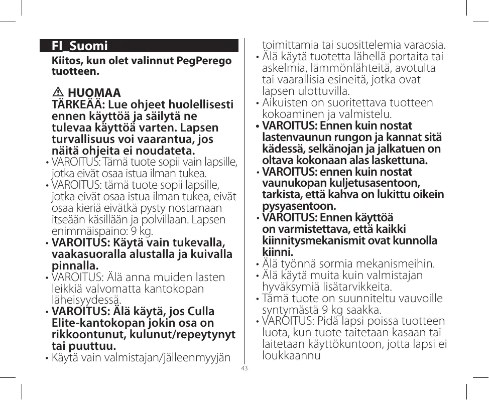 Téléchargez la notice de votre Lastenrattaat au format PDF gratuitement ! Retrouvez votre notice CULLA ELITE - PEG PEREGO et reprennez votre appareil électronique en main. Sur cette page sont publiés tous les documents nécessaires à l'utilisation de votre appareil CULLA ELITE de la marque PEG PEREGO.