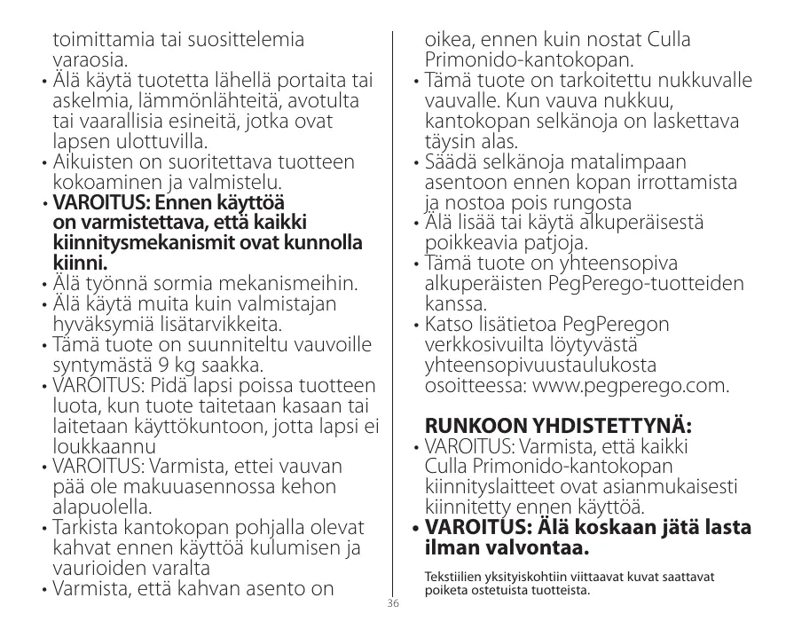 Téléchargez la notice de votre Lastenrattaat ja tarvikkeet au format PDF gratuitement ! Retrouvez votre notice culla primonido - PEG PEREGO et reprennez votre appareil électronique en main. Sur cette page sont publiés tous les documents nécessaires à l'utilisation de votre appareil culla primonido de la marque PEG PEREGO.