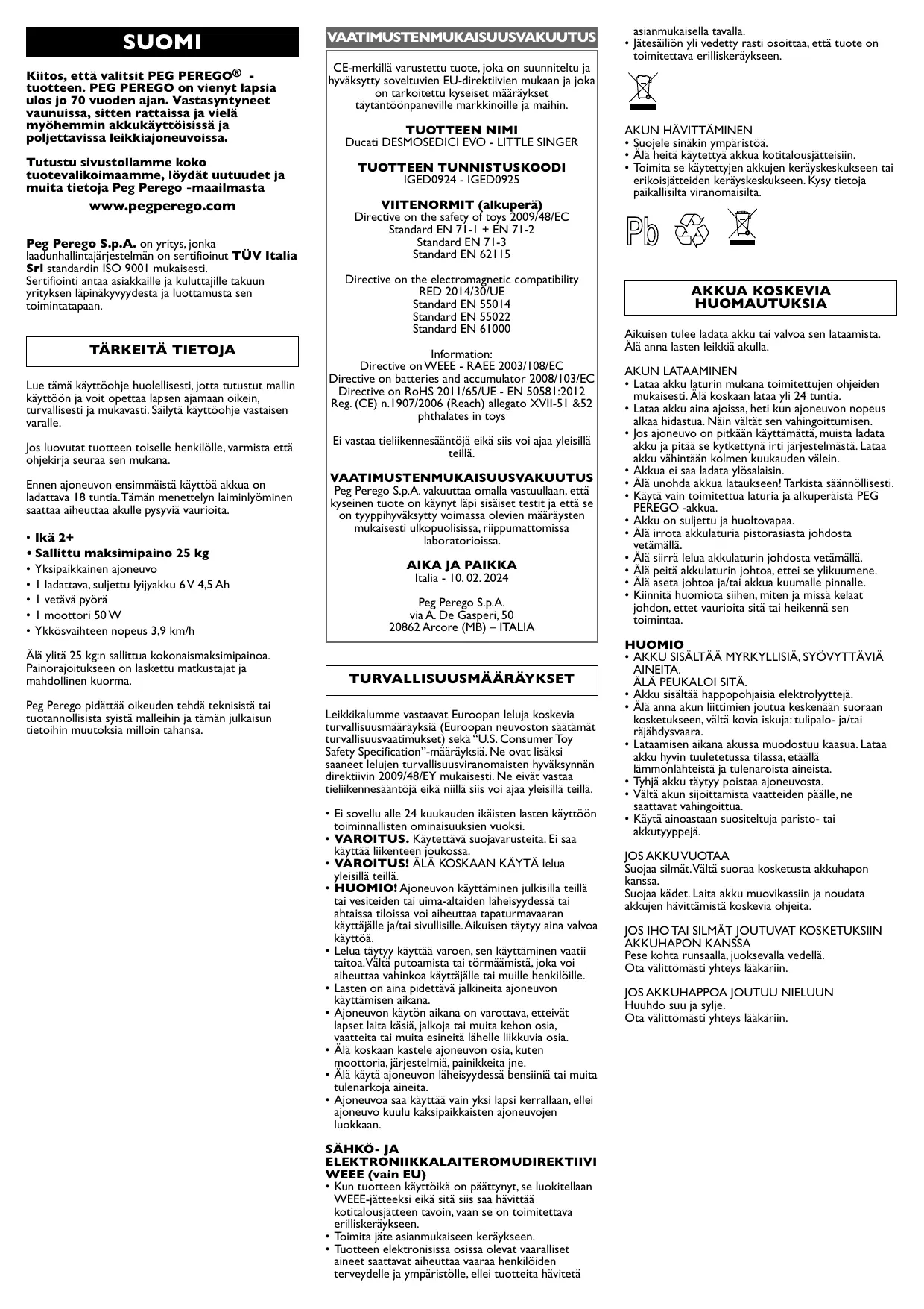 LITTLE SINGER - MOTO POUR ENFANT PEG PEREGO - Notice d'utilisation et mode d'emploi gratuit
