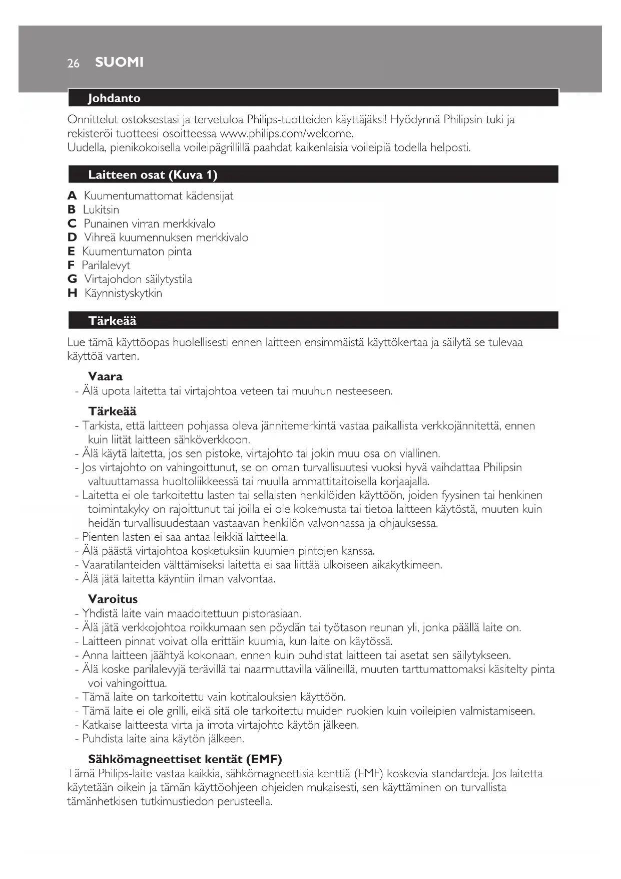 Tämä Philips-laite vastaa kaikkia, sähkömagneettisia kenttiä (EMF) koskevia standardeja. Jos laitetta käytetään oikein ja tämän käyttöohjeen ohjeiden mukaisesti, sen käyttäminen on turvallista tämänhetkisen tutkimustiedon perusteella.