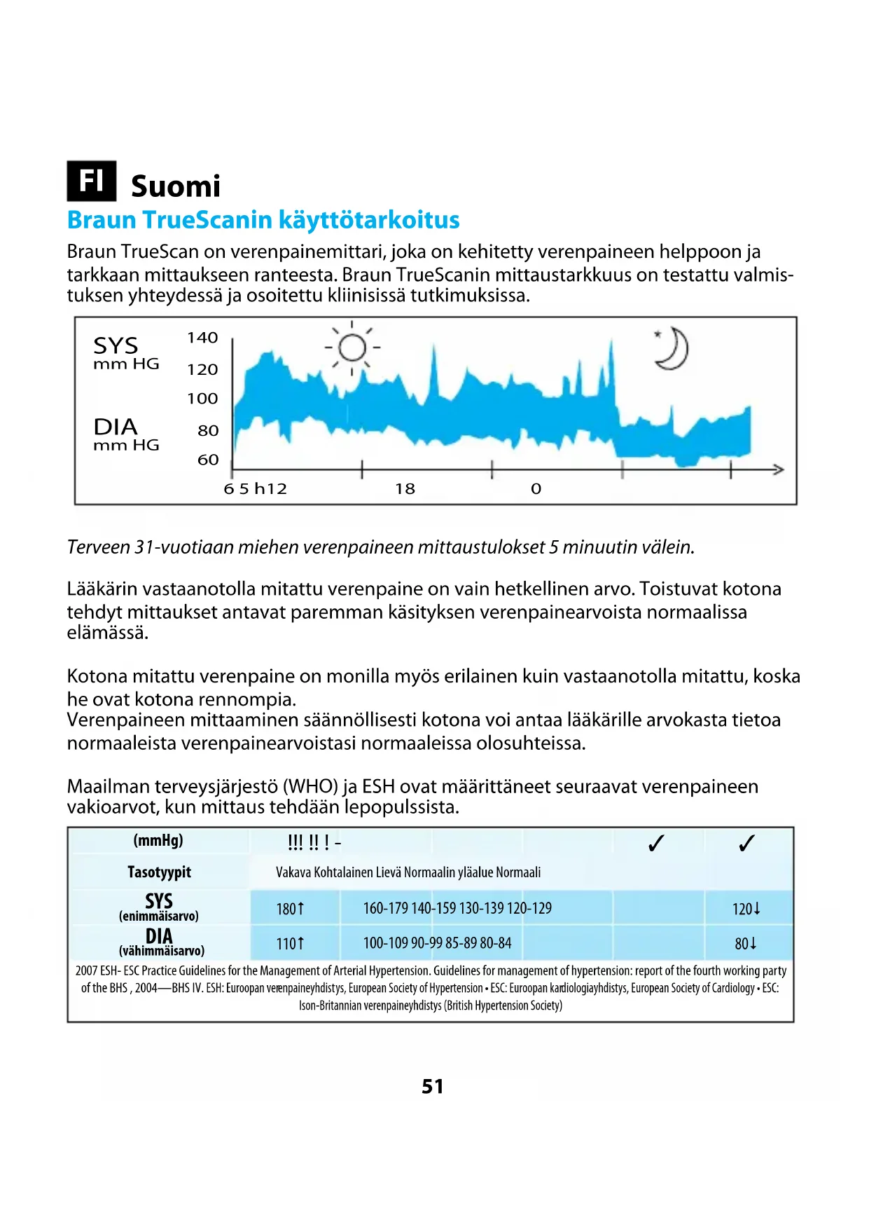 - Systolinen paine on yli 280mmHg Älä liikuta kättä tai puhu, kun teet mittausta. Ei näyttöä Näytössä ei näy tietoja. Tarkista, että paristot on asennettu oikein. Tarkista paristojen napaisuus. Mittaustulos vaikuttaa liian suurelta tai pieneltä Verenpaine vaihtelee jatkuvasti päivän mittaan. Mittaustulokseen vaikuttavat monet tekijät, kuten stressi, kellonaika, yskiminen, nauraminen tai liikkuminen mittauk- sen aikana. Lue kohdat ”Tärkeimmät säännöt tarkkojen veren- painearvojen mittauk- seen” ja ”Mittauksen tekeminen”. Asetusjärjestelmä (A) ei toimi ennen mittausta. Asetusjärjestelmä (A) on poissa käytöstä. Katso kohta «Tilan valitseminen» ja ota asetusjärjestelmä (A) käyttöön.61 Tyypin BF laite Kannettavat ja liikuteltavat RF-viestintälaitteet voivat vaikuttaa SÄHKÖKÄYTTÖISIIN LÄÄKINTÄLAITTEISIIN. VALMISTAJA 10°- 40°C. Lämpötilaraja IP4X: IP-suojausluokka Älä hävitä tuotetta talousjätteen mukana sen käyttöiän päätyttyä. Hävitä laite paikallisen jälleenmyyjän kautta tai toimita se asianmukaiseen keräyspisteeseen. DIREKTIIVIN 2002/96/EY MUKAINEN SÄHKÖ- JA ELEKTRONIIKKALAITTEEN SYMBOLI. Tietoja voidaan muuttaa ilman ilmoitusta. HUOMIOMERKKI. KATSO OHJEASIAKIRJAT. Tuote täyttää lääkinnällisistä laitteista annetun direktiivin 93/42/ETY vaatimukset. SÄHKÖKÄYTTÖINEN LÄÄKINNÄLLINEN LAITE, sähkömagneettiseen yhteensopivuuteen kiinnitettävä erityistä huomiota. Tarkempia tietoja sähkömagneettisesta yhteensopi- vuudesta saa paikallisesta valtuutetusta huoltokeskuksesta (katso takuukortti). Takuu Katso Kaz-asiakaspalvelukeskuskirjasen sisäpuolella oleva ilmoitus.62 Utilisation prévue de Braun TrueScan Braun TrueScan est un moniteur de tension artérielle développé pour la mesure facile et précise de la tension artérielle au poignet. L'exactitude des mesures prises par Braun TrueScan a été testée lors de la fabrication et prouvée par des recherches cliniques, Tension artérielle d'un homme de 31 ans en bonne santé prise toutes les 5 minutes.La tension artérielle mesurée dans le cabinet du médecin ne donne qu'un résultat mo-mentané. Des mesures répétées prises chez soi reètent mieux la valeur de la tension artérielle pendant la vie quotidienne,De plus, nombreuses sont les personnes dont la tension artérielle est diérente lorsqu'elles la mesurent chez elles parce qu'elles y sont plus détendues que dans le cabinet du médecin. Des mesures de votre tension artérielle obtenues chez vous peuvent donner à votre médecin des informations utiles sur votre tension dans les conditions réelles de la vie quotidienne. L'organisation mondiale de la Sante (OMS) et la ESH ont déni les valeurs de tension artérielle normales suivantes prises au repos : (mmHg)