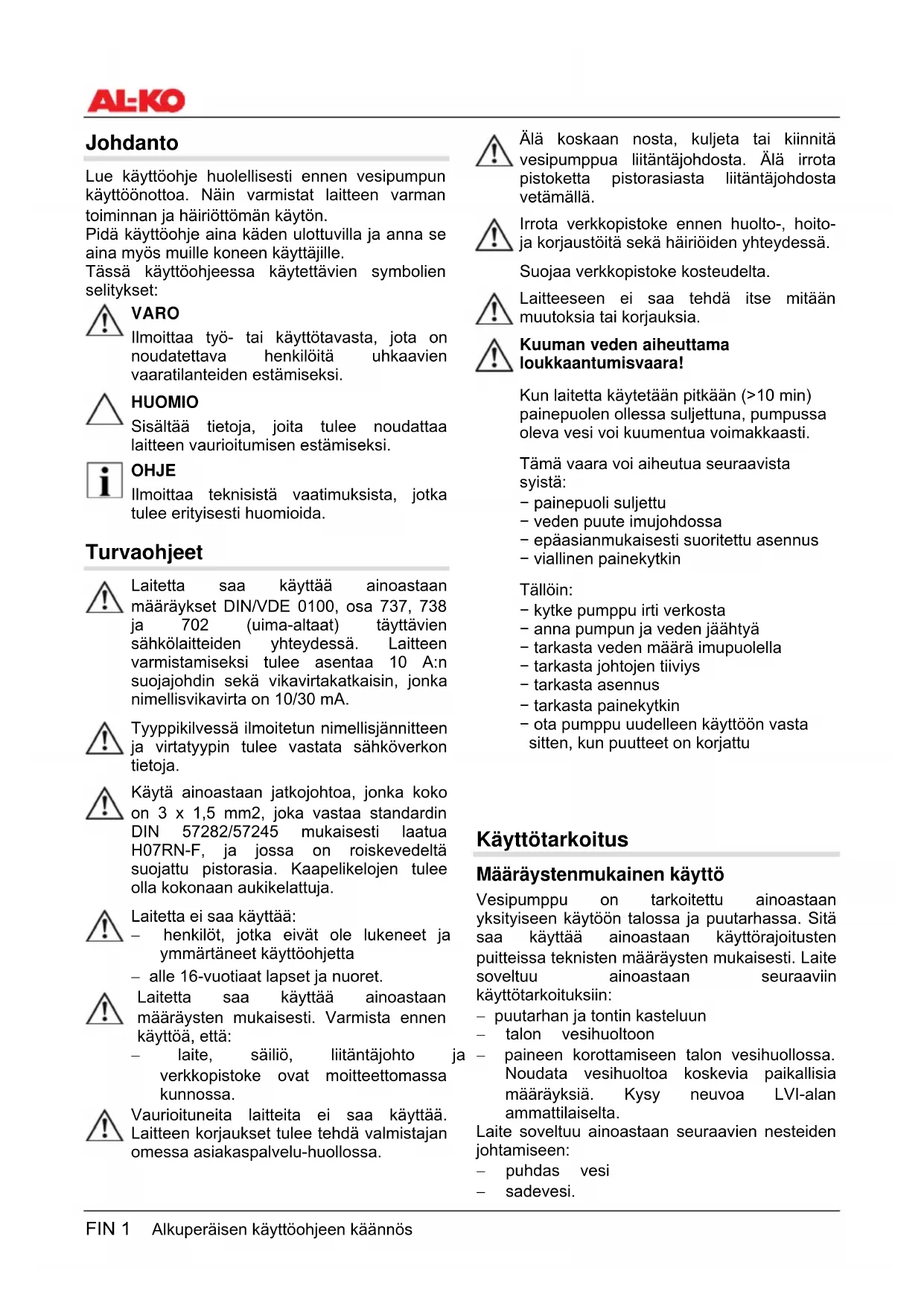 Käyttötarkoitus Määräystenmukainen käyttö Vesipumppu on tarkoitettu ainoastaan yksityiseen käytöön talossa ja puutarhassa. Sitä saa käyttää ainoastaan käyttörajoitusten puitteissa teknisten määräysten mukaisesti. Laite soveltuu ainoastaan seuraaviin käyttötarkoituksiin: − puutarhan ja tontin kasteluun − talon vesihuoltoon − paineen korottamiseen talon vesihuollossa. Noudata vesihuoltoa koskevia paikallisia määräyksiä. Kysy neuvoa LVI-alan ammattilaiselta. Laite soveltuu ainoastaan seuraavien nesteiden johtamiseen: − puhdas vesi − sadevesi. FIN 1 Alkuperäisen käyttöohjeen käännösMääräystenvastainen käyttö Laitetta ei saa käyttää yhtäjaksoisesti. Laite ei sovellu seuraavien nesteiden johtamiseen: − suolavesi − elintarvikkeet − likavesi, jossa on tekstiilin- tai paperinjäämiä − aggressiiviset aineet, kemikaalit − syövyttävät, syttyvät, räjähtävät tai kaasuuntuvat nesteet − nesteet, joiden lämpötila on yli 35 °C − hiekkapitoinen vesi ja hiovat aineet. Laitekuvaus Alkuperäisen käyttöohjeen käännös FIN 2 Vesipumppu/tarvikkeet (kuva A ja B) 1 Pumppukotelo 2 Täyttöaukon tulppa 3 Pumpun ulostuloaukko/painejohtoliitäntä 4 Moottorikotelo 5 Venttiili 6 Säiliö 7 Manometri 8 Liitäntäjohto 9 Tyhjennysruuvi 10 Painekytkin 11 Tasausjohto 12 Poistoruuvi (suodatintila) 13 Pumpun sisääntuloaukko/imuletkuliitäntä 14 Suodattimen läpinäkyvä kansi 15 Kulmanippa 16 Tasotiiviste 17 Liitäntänippa 18 Pyöreä tiivisterengas 19 Painejohto (lisävaruste) 20 AL-KO-imulaitteisto (lisävaruste) 21 Tiiviste suodattimeen 22 Suodatin 23 Takaiskuventtiili 24 Tiiviste 25 Pyöreä tiivisterengas (suodatintilan läpinäkyvä kansi) 26 Tasotiiviste Toimituksen sisältö Vesipumpun varusteina on painekytkin, manometri ja verkkojohto sekä maadoitettu pistoke. Toimitus sisältää myös suodatinavaimen (katso kuva C). Lisätarvikkeet eivät kuulu toimitukseen. Toiminta Vesipumppu toimii automaattisesti. Pumppu kytkeytyy päälle ja pois paineen mukaan (katso tekniset tiedot). Pumppu imee vettä pumpun sisääntulon (13) kautta ja johtaa veden säiliöön (6). Kun poiskytkentäpaine saavutetaan (säiliö on täynnä), pumppu kytkeytyy automaattisesti pois päältä. Jos paine alenee n. 2,0 baariin (vettä otetaan pois), pumppu kytkeytyy automaattisesti päälle ja täyttää säiliötä tai johtaa vettä ottopaikkaan. Tässä tapauksessa säiliö täytetään vasta veden oton päättymisen jälkeen. Lämpösuojaus Laite on varustettu lämpökytkimellä, joka kytkee pumpun pois päältä sen ylikuumentuessa. Noin 15–20 minuutin jäähdytysvaiheen jälkeen pumppu kytkeytyy jälleen automaattisesti päälle. Laitteen asennus ja käyttöönotto Ennen käyttöönottoa tulee tarkistaa kalvon esipaine säiliön venttiilistä (5). Paineen tulee olla n. 1,5 baaria, korjaa painetta tarvittaessa (katso Kalvon esipaineen korjaus).