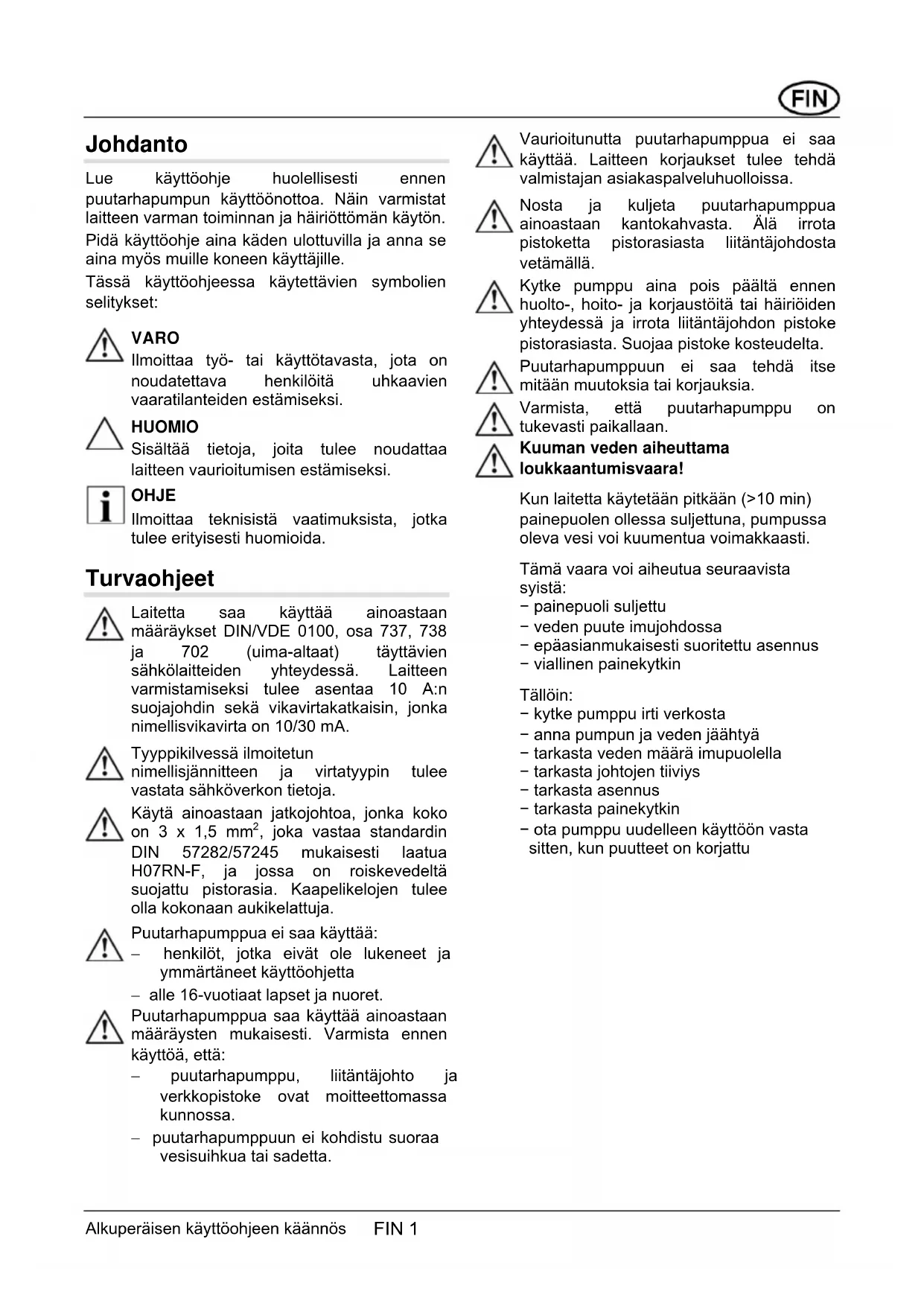 , joka vastaa standardin DIN 57282/57245 mukaisesti laatua H07RN-F, ja jossa on roiskevedeltä suojattu pistorasia. Kaapelikelojen tulee olla kokonaan aukikelattuja. Puutarhapumppua ei saa käyttää: − henkilöt, jotka eivät ole lukeneet ja ymmärtäneet käyttöohjetta − alle 16-vuotiaat lapset ja nuoret. Puutarhapumppua saa käyttää ainoastaan määräysten mukaisesti. Varmista ennen käyttöä, että: − puutarhapumppu, liitäntäjohto ja verkkopistoke ovat moitteettomassa kunnossa. − puutarhapumppuun ei kohdistu suoraa vesisuihkua tai sadetta. Vaurioitunutta puutarhapumppua ei saa käyttää. Laitteen korjaukset tulee tehdä valmistajan asiakaspalveluhuolloissa. Nosta ja kuljeta puutarhapumppua ainoastaan kantokahvasta. Älä irrota pistoketta pistorasiasta liitäntäjohdosta vetämällä. Kytke pumppu aina pois päältä ennen huolto-, hoito- ja korjaustöitä tai häiriöiden yhteydessä ja irrota liitäntäjohdon pistoke pistorasiasta. Suojaa pistoke kosteudelta. Puutarhapumppuun ei saa tehdä itse mitään muutoksia tai korjauksia. Varmista, että puutarhapumppu on tukevasti paikallaan. Kuuman veden aiheuttama loukkaantumisvaara! Kun laitetta käytetään pitkään (>10 min) painepuolen ollessa suljettuna, pumpussa oleva vesi voi kuumentua voimakkaasti. Tämä vaara voi aiheutua seuraavista syistä: − painepuoli suljettu − veden puute imujohdossa − epäasianmukaisesti suoritettu asennus − viallinen painekytkin Tällöin: − kytke pumppu irti verkosta − anna pumpun ja veden jäähtyä − tarkasta veden määrä imupuolella − tarkasta johtojen tiiviys − tarkasta asennus − tarkasta painekytkin − ota pumppu uudelleen käyttöön vasta sitten, kun puutteet on korjattu Alkuperäisen käyttöohjeen käännös FIN 1Käyttötarkoitus FIN 2 Alkuperäisen käyttöohjeen käännös Määräystenmukainen käyttö Puutarhapumppu on tarkoitettu ainoastaan yksityiseen käyttöön talossa ja puutarhassa. Sitä saa käyttää ainoastaan käyttörajoitusten puitteissa teknisten määräysten mukaisesti. Puutarhapumppu soveltuu ainoastaan seuraaviin käyttötarkoituksiin: − sadetukseen ja kasteluun (esim. nurmikkoalueet, kasvimaat ja puutarhat) − säiliöiden täyttämiseen ja tyhjentämiseen (esim. uima-altaat) − veden ottamiseen kaivoista, sadevesitynnyreistä ja vesisäiliöistä. Laite soveltuu ainoastaan seuraavien nesteiden johtamiseen: − puhdas vesi − sadevesi − klooripitoinen vesi (uima-altaiden vesi). Määräystenvastainen käyttö Puutarhapumppua ei saa käyttää yhtäjaksoisesti. Laite ei sovellu seuraavien nesteiden johtamiseen: − juomavesi − suolapitoinen vesi − elintarvikkeet − likavesi − aggressiiviset aineet, kemikaalit − syövyttävät, syttyvät, räjähtävät tai kaasuuntuvat nesteet − nesteet, joiden lämpötila on yli 35 °C − hiekkapitoinen vesi ja hiovat aineet. Laitekuvaus Puutarhapumppu/tarvikkeet (kuva A, B ja C) 1 Pumpun sisääntuloaukko/imuletkuliitäntä 2 Täyttöaukon tulppa 3 Pumpun ulostuloaukko/painejohtoliitäntä 4 Moottorikotelo 5 Liitäntäjohto 6 Virtakytkin 7 Pumpun jalkaosa 8 Pumppukotelo 9 Pumpputilan tyhjennysruuvi 10 Suodatintilan tyhjennysruuvi 11 Läpinäkyvä kansi 12 Suodattimen tiivisteet 13 Suodatin 14 Takaiskuventtiili 15 Tiiviste 16 Pyöreä tiivisterengas (suodatintilan läpinäkyvä kansi) 17 Tasotiiviste 18 Kulmanippa 19 Tasotiiviste 20 Liitäntänippa 21 Pyöreä tiivisterengas 22 Painejohto (lisätarvike) 23 Imulaitteisto (lisätarvike) Suodatinavain (kuva B)