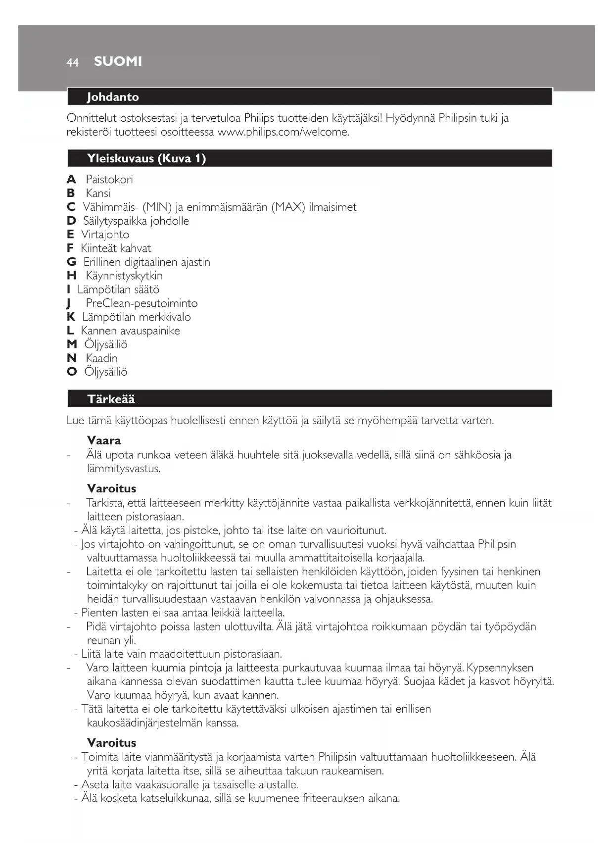 - Jos virtajohto on vahingoittunut, se on oman turvallisuutesi vuoksi hyvä vaihdattaa Philipsin