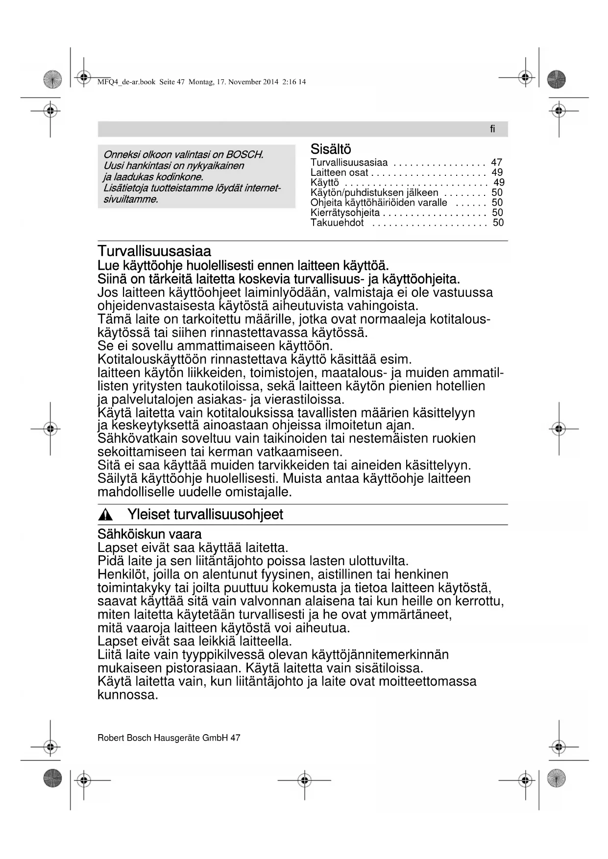 MFQ4_de-ar.book Seite 46 Montag, 17. November 2014 2:16 1447Robert Bosch Hausgeräte GmbH 47 Sisältö Turvallisuusasiaa . . . . . . . . . . . . . . . . . 47Laitteen osat . . . . . . . . . . . . . . . . . . . . . 49Käyttö . . . . . . . . . . . . . . . . . . . . . . . . . . 49Käytön/puhdistuksen jälkeen . . . . . . . . 50Ohjeita käyttöhäiriöiden varalle . . . . . . 50Kierrätysohjeita . . . . . . . . . . . . . . . . . . . 50Takuuehdot . . . . . . . . . . . . . . . . . . . . . 50 Turvallisuusasiaa