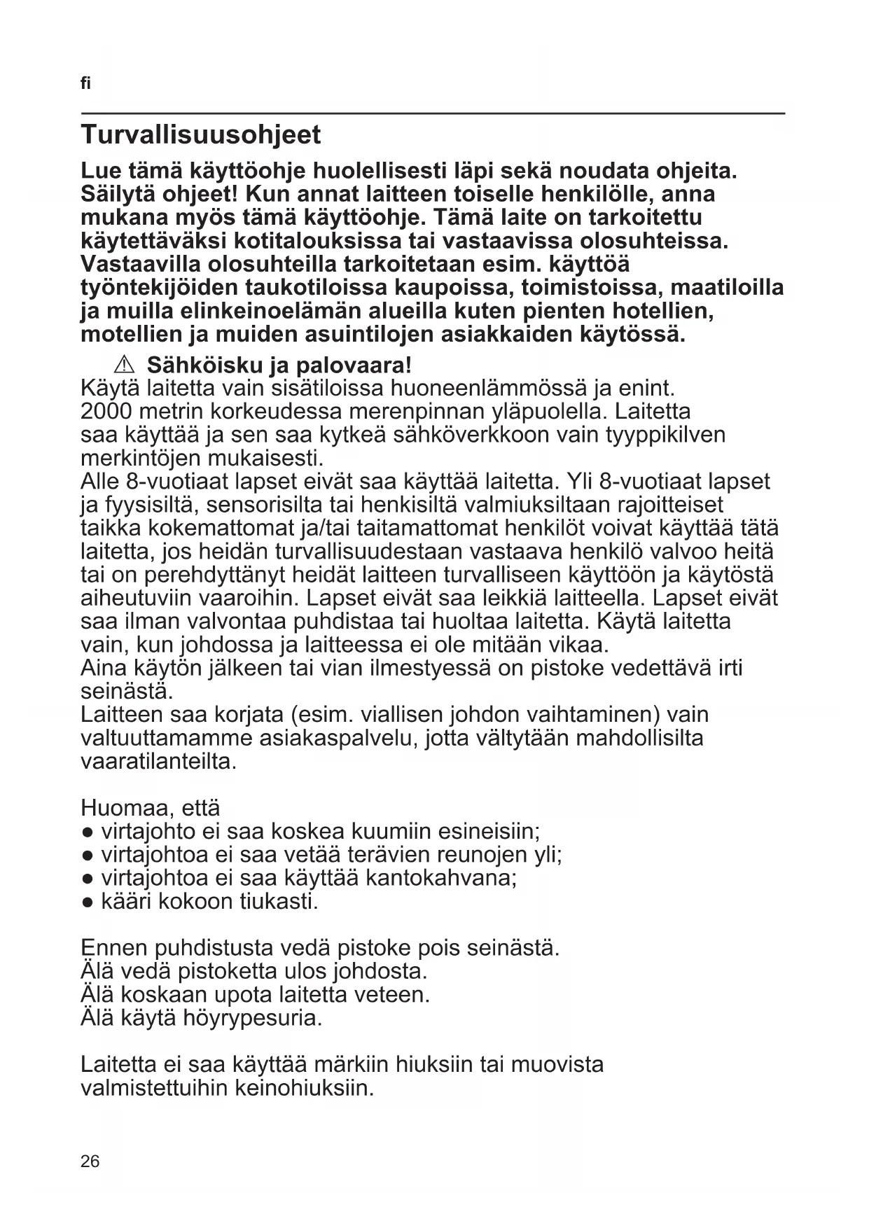 Turvallisuusohjeet Lue tämä käyttöohje huolellisesti läpi sekä noudata ohjeita. Säilytä ohjeet! Kun annat laitteen toiselle henkilölle, anna mukana myös tämä käyttöohje. Tämä laite on tarkoitettu käytettäväksi kotitalouksissa tai vastaavissa olosuhteissa. Vastaavilla olosuhteilla tarkoitetaan esim. käyttöä työntekijöiden taukotiloissa kaupoissa, toimistoissa, maatiloilla ja muilla elinkeinoelämän alueilla kuten pienten hotellien, motellien ja muiden asuintilojen asiakkaiden käytössä. A Sähköisku ja palovaara! Käytä laitetta vain sisätiloissa huoneenlämmössä ja enint. 2000 metrin korkeudessa merenpinnan yläpuolella. Laitetta saa käyttää ja sen saa kytkeä sähköverkkoon vain tyyppikilven merkintöjen mukaisesti. Alle 8-vuotiaat lapset eivät saa käyttää laitetta. Yli 8-vuotiaat lapset ja fyysisiltä, sensorisilta tai henkisiltä valmiuksiltaan rajoitteiset taikka kokemattomat ja/tai taitamattomat henkilöt voivat käyttää tätä laitetta, jos heidän turvallisuudestaan vastaava henkilö valvoo heitä tai on perehdyttänyt heidät laitteen turvalliseen käyttöön ja käytöstä aiheutuviin vaaroihin. Lapset eivät saa leikkiä laitteella. Lapset eivät saa ilman valvontaa puhdistaa tai huoltaa laitetta. Käytä laitetta vain, kun johdossa ja laitteessa ei ole mitään vikaa. Aina käytön jälkeen tai vian ilmestyessä on pistoke vedettävä irti seinästä. Laitteen saa korjata (esim. viallisen johdon vaihtaminen) vain valtuuttamamme asiakaspalvelu, jotta vältytään mahdollisilta vaaratilanteilta. Huomaa, että ● virtajohto ei saa koskea kuumiin esineisiin; ● virtajohtoa ei saa vetää terävien reunojen yli; ● virtajohtoa ei saa käyttää kantokahvana; ● kääri kokoon tiukasti. Ennen puhdistusta vedä pistoke pois seinästä. Älä vedä pistoketta ulos johdosta. Älä koskaan upota laitetta veteen. Älä käytä höyrypesuria. Laitetta ei saa käyttää märkiin hiuksiin tai muovista valmistettuihin keinohiuksiin.27