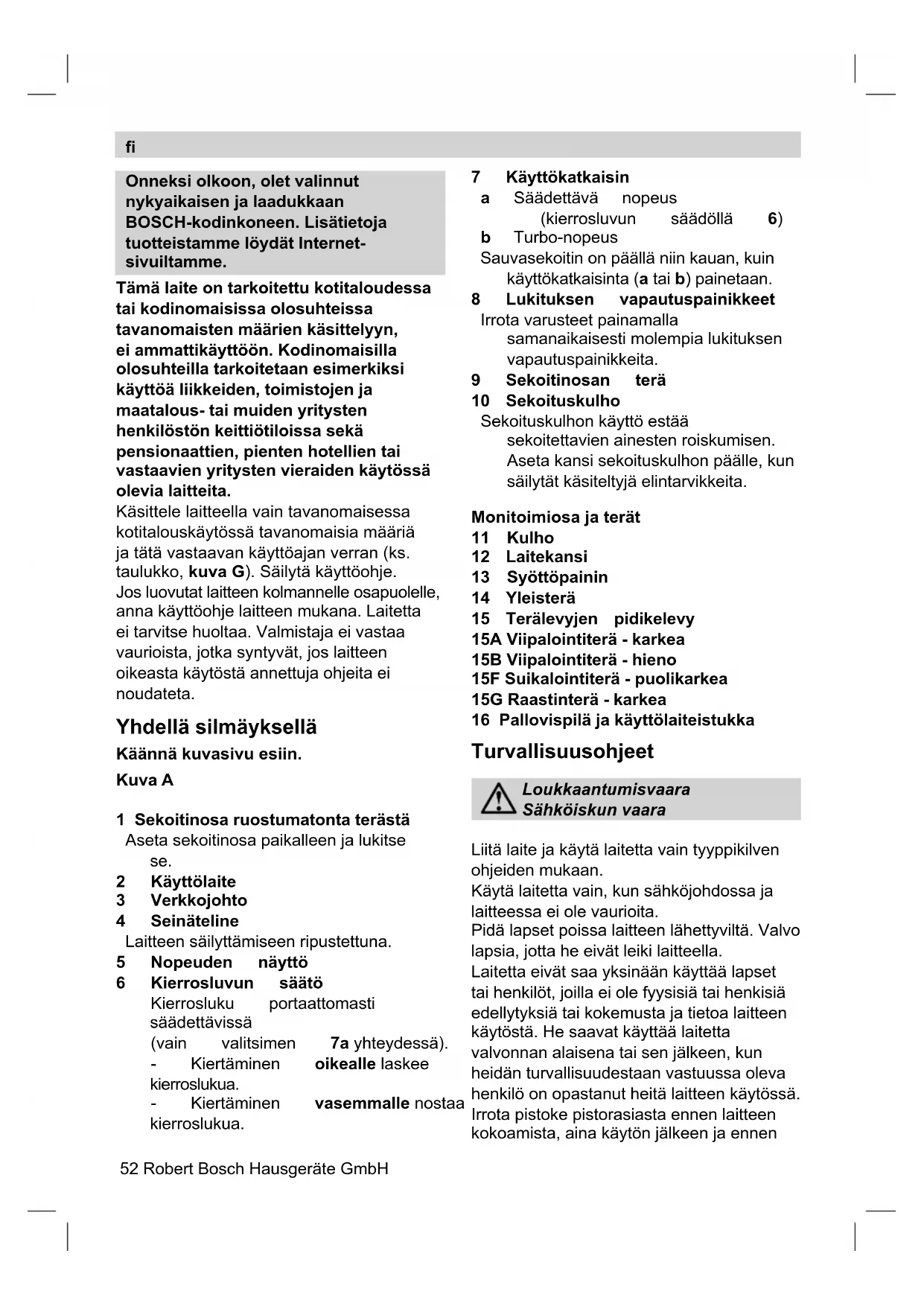 Téléchargez la notice de votre Tehosekoitin au format PDF gratuitement ! Retrouvez votre notice MSM7800 - BOSCH et reprennez votre appareil électronique en main. Sur cette page sont publiés tous les documents nécessaires à l'utilisation de votre appareil MSM7800 de la marque BOSCH.