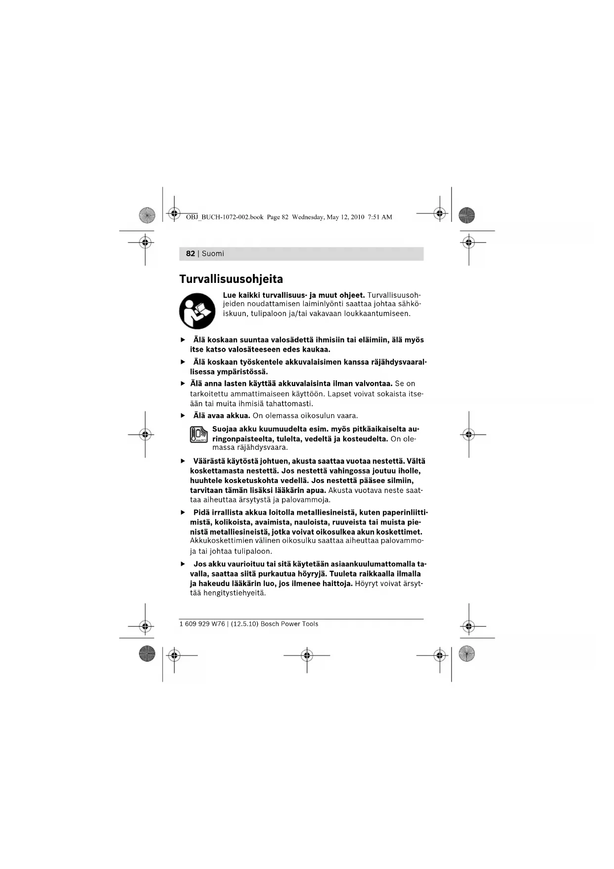 Turvallisuusohjeita Lue kaikki turvallisuus- ja muut ohjeet. Turvallisuusoh- jeiden noudattamisen laiminlyönti saattaa johtaa sähkö- iskuun, tulipaloon ja/tai vakavaan loukkaantumiseen. f Älä koskaan suuntaa valosädettä ihmisiin tai eläimiin, älä myös itse katso valosäteeseen edes kaukaa. f Älä koskaan työskentele akkuvalaisimen kanssa räjähdysvaaral- lisessa ympäristössä. f Älä anna lasten käyttää akkuvalaisinta ilman valvontaa. Se on tarkoitettu ammattimaiseen käyttöön. Lapset voivat sokaista itse- ään tai muita ihmisiä tahattomasti. f Älä avaa akkua. On olemassa oikosulun vaara. Suojaa akku kuumuudelta esim. myös pitkäaikaiselta au- ringonpaisteelta, tulelta, vedeltä ja kosteudelta. On ole- massa räjähdysvaara. f Väärästä käytöstä johtuen, akusta saattaa vuotaa nestettä. Vältä koskettamasta nestettä. Jos nestettä vahingossa joutuu iholle, huuhtele kosketuskohta vedellä. Jos nestettä pääsee silmiin, tarvitaan tämän lisäksi lääkärin apua. Akusta vuotava neste saat- taa aiheuttaa ärsytystä ja palovammoja. f Pidä irrallista akkua loitolla metalliesineistä, kuten paperinliitti- mistä, kolikoista, avaimista, nauloista, ruuveista tai muista pie- nistä metalliesineistä, jotka voivat oikosulkea akun koskettimet. Akkukoskettimien välinen oikosulku saattaa aiheuttaa palovammo- ja tai johtaa tulipaloon. f Jos akku vaurioituu tai sitä käytetään asiaankuulumattomalla ta- valla, saattaa siitä purkautua höyryjä. Tuuleta raikkaalla ilmalla ja hakeudu lääkärin luo, jos ilmenee haittoja. Höyryt voivat ärsyt- tää hengitystiehyeitä. OBJ_BUCH-1072-002.book Page 82 Wednesday, May 12, 2010 7:51 AMSuomi | 83 Bosch Power Tools 1 609 929 W76 | (12.5.10) f Lataa akku vain valmistajan suosittelemassa latauslaitteessa. Latauslaite, joka soveltuu määrätyntyyppiselle akulle, saattaa muodostaa tulipalovaaran erilaista akkua ladattaessa. f Käytä akkua ainoastaan yhdessä Bosch-sähkötyökalusi kanssa. Vain täten suojaat akkusi vaaralliselta ylikuormitukselta. f Käytä vain alkuperäisiä Bosch-akkuja, joiden jännite vastaa säh- kötyökalusi tyyppikilvessä olevaa jännitettä. Muita akkuja käytet- täessä, esim. jäljitelmiä, työstettyjä akkuja tai vieraita valmisteita, on olemassa räjähtävien akkujen aiheuttama loukkaantumisvaara ja ainevahinkovaara. Toimintaselostus Määräyksenmukainen käyttö Akkuvalaisin on tarkoitettu kädessä pidettäväksi, kuivien tilojen rajattuun valaisemiseen. Kuvassa olevat osat Kuvassa olevien osien numerointi viittaa grafiikkasivussa olevaan akkuvalaisimen kuvaan. 1 Lampun pää 2 Käynnistyskytkin 3 Akku* 4 Akun vapautuspainike 5 Vyöpidin *Kuvassa tai selostuksessa esiintyvä lisätarvike ei kuulu vakiotoimitukseen. Löydät täydellisen tarvikeluettelon tarvikeohjelmastamme. OBJ_BUCH-1072-002.book Page 83 Wednesday, May 12, 2010 7:51 AM1 609 929 W76 | (12.5.10) Bosch Power Tools 84 | Suomi Tekniset tiedot Asennus Akun lataus (lisätarvike) (katso kuva A) f Käytä vain tarvikesivulla mainittuja latauslaitteita. Vain nämä la- tauslaitteet on sovitettu akkuvalaisimessasi käytettävälle litiumio- ni-akulle. Ohje: Akku toimitetaan osittain ladattuna. Jotta akun täysi teho voi- taisiin taata, tulee akku ennen ensimmäistä käyttöönottoa ladata täy- teen latauslaitteessa. Litiumioniakkua voidaan ladata milloin vain, lyhentämättä akun elin- ikää. Latauksen keskeytys ei vaurioita akkua. Li-ioni-akkua suojaa syväpurkaukselta ”Electronic Cell Protection (ECP)”. Akun tyhjetessä suojakytkentä sammuttaa akkuvalaisimen. Älä enää paina käynnistyskytkintä akkuvalaisimen auto- maattisen poiskytkennän jälkeen. Akku saattaa vahin- goittua. Akkuvalaisin GLI 10,8 V-LI Professional Tuotenumero 3 601 D37 U.. Nimellisjännite V= 10,8 Valaisuaika, n. min 450 Käyttölämpötila °C – 10 ... +40 Varastointilämpötila °C – 15 ... +50 Paino vastaa EPTA-Procedure 01/2003 kg 0,3 Ota huomioon akkuvalaisimesi tyyppikilvessä oleva tuotenumero. Yksittäisten akkuvalaisinten kauppanimitys saattaa vaihdella. HUOM OBJ_BUCH-1072-002.book Page 84 Wednesday, May 12, 2010 7:51 AMSuomi | 85 Bosch Power Tools 1 609 929 W76 | (12.5.10) Irrota akku 3 painamalla lukkopainikkeita 4 ja vetämällä akku taakse- päin ulos akkuvalaisimesta. Älä käytä voimaa tähän. Akku on varustettu NTC-lämpötilanvalvonnalla, joka sallii lataamisen vain akun lämpötilan ollessa välillä 0 °C ja 45 °C. Täten saavutetaan pitkä käyttöikä akulle. Ota huomioon hävitysohjeet. Käyttö Käyttöönotto Akun asennus f Käytä vain alkuperäisiä Bosch Li-ioni-akkuja, joiden jännite vas- taa akkuvalaisimesi tyyppikilvessä olevaa jännitettä. Jonkun muun akun käyttö saattaa johtaa loukkaantumiseen ja tulipaloon. Työnnä ladattu akku 3 kahvaan, kunnes se lukkiutuu tuntuvasti ja asettuu tasaisesti kiinni kahvaan. Käynnistys ja pysäytys f Akkuvalaisin tuottaa valosäteen, joka säteilee lamppupäästä 1. Sytytä akkuvalaisin painamalla käynnistyskytkintä 2. Sammuta akkuvalaisin painamalla käynnistyskytkintä 2 uudelleen. Syväpurkaussuoja Li-ioni-akkua suojaa syväpurkaukselta ”Electronic Cell Protection (ECP)”. Akun tyhjetessä suojakytkentä sammuttaa akkuvalaisimen. Työskentelyohjeita Vyöpidin (katso kuva B) Vyöpitimen 5 avulla voit ripustaa akkuvalaisimen esim. vyöhön. Sinul- la on silloin molemmat kädet vapaana ja akkuvalaisin on kuitenkin mil- loin vain saatavilla. OBJ_BUCH-1072-002.book Page 85 Wednesday, May 12, 2010 7:51 AM1 609 929 W76 | (12.5.10) Bosch Power Tools 86 | Suomi Hoito ja huolto Huolto ja puhdistus Jos akku ei enää toimi, käänny Bosch-sopimushuollon puoleen. Akkuvalaisin on huoltovapaa, eikä siinä ole vaihdettavia tai huolletta- via osia. Puhdista akkuvalaisimen muovilevy vain kuivalla pehmeällä liinalla, vaurioiden välttämiseksi. Älä käytä puhdistusaineita tai liuottimia. Jos akkuvalaisimessa, huolellisesta valmistuksesta ja koestusmenet- telystä