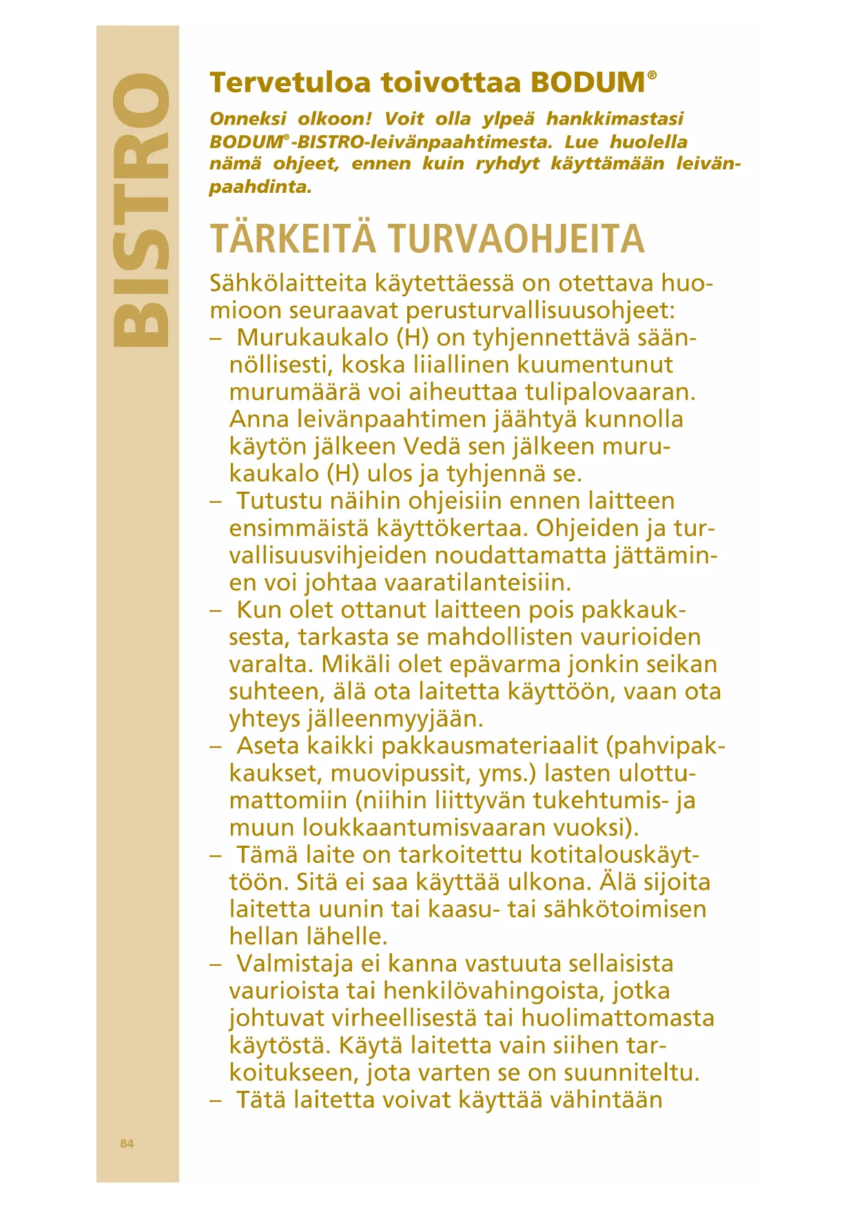 8-vuotiaat lapset ja henkilöt, joilla on alen- tunut fyysinen, aisteihin liittyvä tai henki- nen toimintakyky tai joilla ei ole kokemusta ja tietoja laitteen käytöstä, jos heitä on valvottu ja opastettu laitteen turvallisessa käytössä ja jos he ymmärtävät siihen liit- tyvät vaarat. Älä anna lasten leikkiä lait- teella. Vain yli 8-vuotias lapsi saa puhdistaa ja hoitaa laitetta, ja tämän on tapahdut- tava valvottuna. Pidä laite ja sen virtajohto alle 8-vuotiaiden lasten ulottumattomissa. – Laitetta ei saa koskaan koskettaa koste- illa tai märillä käsillä. Älä koskaan kosketa virtajohtoa tai pistoketta märillä käsillä. Kun irrotat virtajohdon verkosta, vedä se aina irti pistokkeesta, älä koskaan vedä itse johdosta. Älä anna virtajohdon roikkua alas pöydältä tai työtasolta, ja huolehdi siitä, että virtajohto ei joudu kosketuksiin kuumi- en pintojen kanssa. Älä koskaan käytä säh- kölaitetta, jos laitteen virtajohto tai pistoke on vaurioitunut, jos laitteen toiminnassa on havaittu poikkeuksia tai jos laite on jollain tavoin vaurioitunut. – Palauta laite lähimpään valtuutettuun huoltoyritykseen tutkittavaksi, korjattavaksi tai säädettäväksi. – Lisävarusteiden käyttö, joita laitteen valmistaja ei suosittele, voivat aiheuttaa tulipalon, sähköiskun tai henkilövahinkoja. – Mikäli jokin vika tai virhetoiminto ilmenee, kytke laite pois päältä. Älä yritä korjata laitetta itse. Vie laite korjattavaksi valmistajan valtuut- tamaan huoltoliikkeeseen. Edellä mainittu- jen varotoimien laiminlyöminen voi vaikut- taa laitteen turvallisuuteen. – Älä koskaan yritä itse vaihtaa laitteen vir- tajohtoa. Siihen tarvitaan erikoistyökaluja.86 BISTRO Laitteen käyttöturvallisuus edellyttää, että virtajohdon korjauksen ja uuden vir- tajohdon asentamisen saa suorittaa vain valmistajan valtuuttama huoltoliike. – Irrota laite verkosta käytön jälkeen ja ennen kuin ryhdyt puhdistamaan sitä. Anna laitteen jäähtyä, ennen kuin lisäät siihen osia tai otat niitä pois. Älä koskaan upota johtoa, pistoketta tai mitään muuta laitteen osaa veteen: puhdista laite vain kosteaa liinaa käyttäen. Muista aina, että kyse on sähkötoimisesta laitteesta. – Katkaise laitteen virta virtakytkimestä ja poista sen jälkeen pistoke pistorasiasta. – Älä kasta virtajohtoa tai pistoketta veteen tai muuhun nesteeseen. Jos teet niin, voi siitä seurata tulipalo, sähköisku tai henkilö- vahinko. – Älä koskaan työnnä sormiasi paahtoleipää varten tarkoitettuun paahdinaukkoon, jos laitteen virtajohto on kytketty pistorasiaan tai laite on päällä. – Älä työnnä folioon käärittyjä, liian suuria ruokia tai ruokailuvälineitä leivänpaahti- meen, sillä ne voivat aiheuttaa tulipalon tai sähköiskun vaaran. – Älä paahda täytettyä tai kuorrutettua leipää. Kuorrutteet ja täyte voivat muuttua lämmet- essä pehmeiksi tai juokseviksi. – Älä koskaan työnnä teräviä tai naarmut- tavia esineitä leivänpaahtimen, koska ne voivat vahingoittaa laitetta. – Leivänpaahtimen sivut sekä paahdinaukon ympäristö ovat kuumia, jos laite on päällä. Kun leivänpaahdin on päällä, älä kosketa muita kuin sen muovisia osia. – Älä koskaan peitä laitetta sen ollessa päällä. – Älä koskaan kierrä virtajohtoa leivänpaahti- men ympärille sen ollessa päällä tai käytön87
