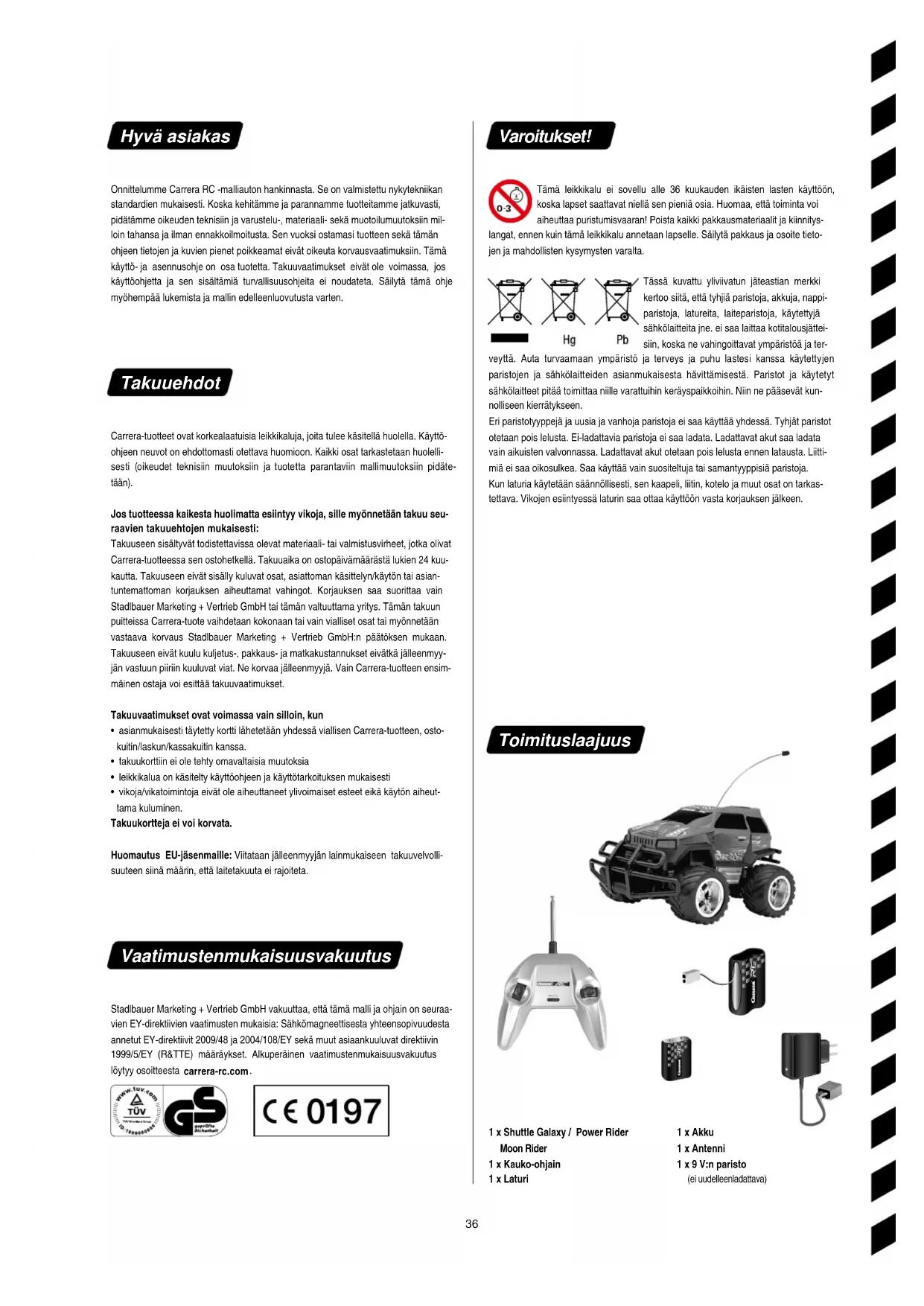 Varoitukset! Tämä leikkikalu ei sovellu alle 36 kuukauden ikäisten lasten käyttöön, koska lapset saattavat niellä sen pieniä osia. Huomaa, että toiminta voi aiheuttaa puristumisvaaran! Poista kaikki pakkausmateriaalit ja kiinnitys- langat, ennen kuin tämä leikkikalu annetaan lapselle. Säilytä pakkaus ja osoite tieto- jen ja mahdollisten kysymysten varalta. Tässä kuvattu yliviivatun jäteastian merkki kertoo siitä, että tyhjiä paristoja, akkuja, nappi- paristoja, latureita, laiteparistoja, käytettyjä sähkölaitteita jne. ei saa laittaa kotitalousjättei- siin, koska ne vahingoittavat ympäristöä ja ter- veyttä. Auta turvaamaan ympäristö ja terveys ja puhu lastesi kanssa käytettyjen paristojen ja sähkölaitteiden asianmukaisesta hävittämisestä. Paristot ja käytetyt sähkölaitteet pitää toimittaa niille varattuihin keräyspaikkoihin. Niin ne pääsevät kun- nolliseen kierrätykseen. Eri paristotyyppejä ja uusia ja vanhoja paristoja ei saa käyttää yhdessä. Tyhjät paristot otetaan pois lelusta. Ei-ladattavia paristoja ei saa ladata. Ladattavat akut saa ladata vain aikuisten valvonnassa. Ladattavat akut otetaan pois lelusta ennen latausta. Liitti- miä ei saa oikosulkea. Saa käyttää vain suositeltuja tai samantyyppisiä paristoja. Kun laturia käytetään säännöllisesti, sen kaapeli, liitin, kotelo ja muut osat on tarkas- tettava. Vikojen esiintyessä laturin saa ottaa käyttöön vasta korjauksen jälkeen. Toimituslaajuus 1 x Akku 1 x Antenni 1 x 9 V:n paristo (ei uudelleenladattava) 1 x Shuttle Galaxy / Power Rider Moon Rider 1 x Kaukoohjain 1 x Laturi1