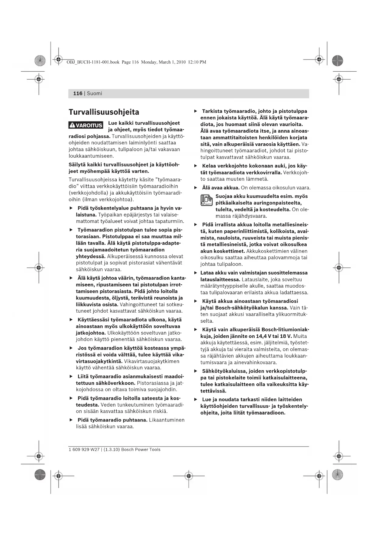 Turvallisuusohjeita Lue kaikki turvallisuusohjeet ja ohjeet, myös tiedot työmaa- radiosi pohjassa. Turvallisuusohjeiden ja käyttö- ohjeiden noudattamisen laiminlyönti saattaa johtaa sähköiskuun, tulipaloon ja/tai vakavaan loukkaantumiseen. Säilytä kaikki turvallisuusohjeet ja käyttöoh- jeet myöhempää käyttöä varten. Turvallisuusohjeissa käytetty käsite ”työmaara- dio” viittaa verkkokäyttöisiin työmaaradioihin (verkkojohdolla) ja akkukäyttöisiin työmaaradi- oihin (ilman verkkojohtoa). f Pidä työskentelyalue puhtaana ja hyvin va- laistuna. Työpaikan epäjärjestys tai valaise- mattomat työalueet voivat johtaa tapaturmiin. f Työmaaradion pistotulpan tulee sopia pis- torasiaan. Pistotulppaa ei saa muuttaa mil- lään tavalla. Älä käytä pistotulppa-adapte- ria suojamaadoitetun työmaaradion yhteydessä. Alkuperäisessä kunnossa olevat pistotulpat ja sopivat pistorasiat vähentävät sähköiskun vaaraa. f Älä käytä johtoa väärin, työmaaradion kanta- miseen, ripustamiseen tai pistotulpan irrot- tamiseen pistorasiasta. Pidä johto loitolla kuumuudesta, öljystä, terävistä reunoista ja liikkuvista osista. Vahingoittuneet tai sotkeu- tuneet johdot kasvattavat sähköiskun vaaraa. f Käyttäessäsi työmaaradiota ulkona, käytä ainoastaan myös ulkokäyttöön soveltuvaa jatkojohtoa. Ulkokäyttöön soveltuvan jatko- johdon käyttö pienentää sähköiskun vaaraa. f Jos työmaaradion käyttöä kosteassa ympä- ristössä ei voida välttää, tulee käyttää vika- virtasuojakytkintä. Vikavirtasuojakytkimen käyttö vähentää sähköiskun vaaraa. f Liitä työmaaradio asianmukaisesti maadoi- tettuun sähköverkkoon. Pistorasiassa ja jat- kojohdossa on oltava toimiva suojajohdin. f Pidä työmaaradio loitolla sateesta ja kos- teudesta. Veden tunkeutuminen työmaaradi- on sisään kasvattaa sähköiskun riskiä. f Pidä työmaaradio puhtaana. Likaantuminen lisää sähköiskun vaaraa. f Tarkista työmaaradio, johto ja pistotulppa ennen jokaista käyttöä. Älä käytä työmaara- diota, jos huomaat siinä olevan vaurioita. Älä avaa työmaaradiota itse, ja anna ainoas- taan ammattitaitoisten henkilöiden korjata sitä, vain alkuperäisiä varaosia käyttäen. Va- hingoittuneet työmaaradiot, johdot tai pisto- tulpat kasvattavat sähköiskun vaaraa. f Kelaa verkkojohto kokonaan auki, jos käy- tät työmaaradiota verkkovirralla. Verkkojoh- to saattaa muuten lämmetä. f Älä avaa akkua. On olemassa oikosulun vaara. Suojaa akku kuumuudelta esim. myös pitkäaikaiselta auringonpaisteelta, tulelta, vedeltä ja kosteudelta. On ole- massa räjähdysvaara. f Pidä irrallista akkua loitolla metalliesineis- tä, kuten paperinliittimistä, kolikoista, avai- mista, nauloista, ruuveista tai muista pienis- tä metalliesineistä, jotka voivat oikosulkea akun koskettimet. Akkukoskettimien välinen oikosulku saattaa aiheuttaa palovammoja tai johtaa tulipaloon.