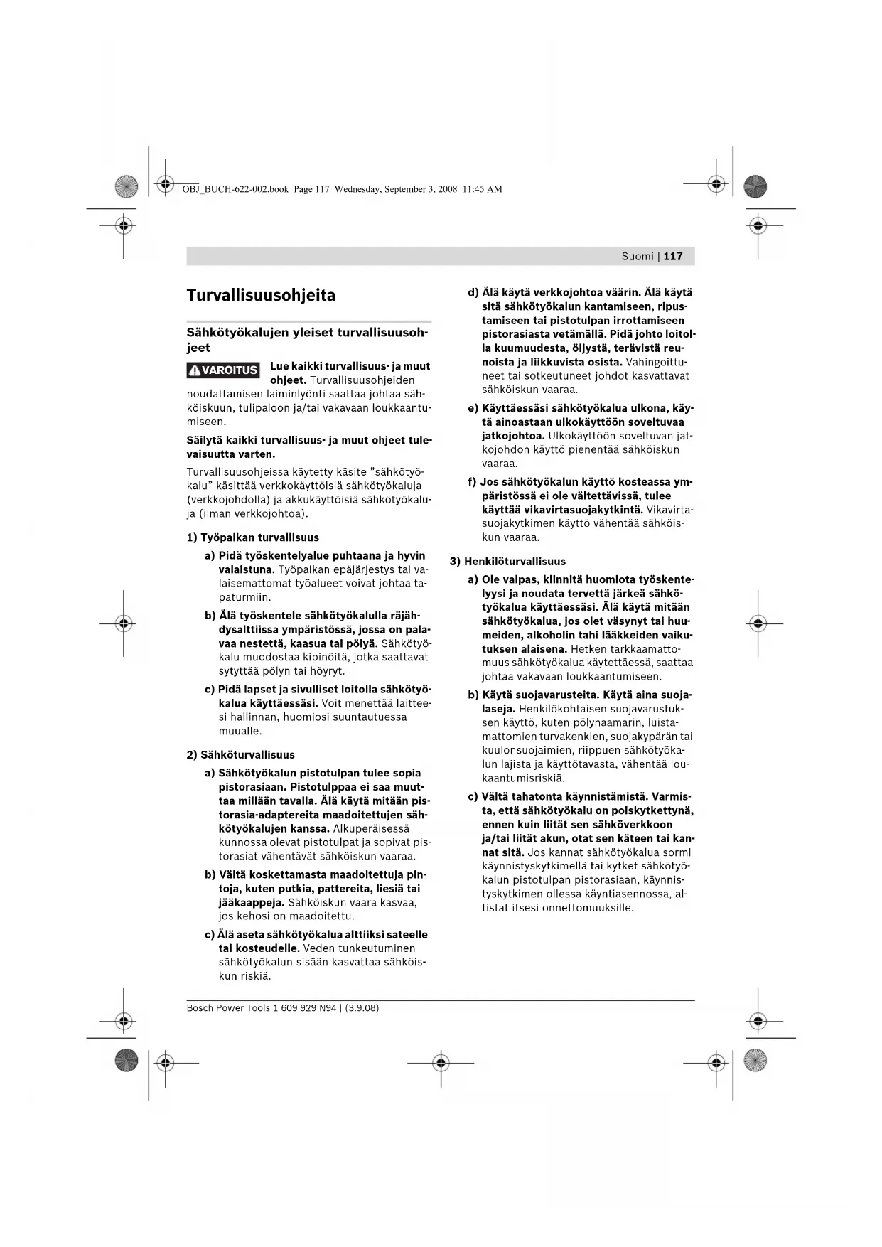 a) Ole valpas, kiinnitä huomiota työskente- lyysi ja noudata tervettä järkeä sähkö- työkalua käyttäessäsi. Älä käytä mitään sähkötyökalua, jos olet väsynyt tai huu- meiden, alkoholin tahi lääkkeiden vaiku- tuksen alaisena. Hetken tarkkaamatto- muus sähkötyökalua käytettäessä, saattaa johtaa vakavaan loukkaantumiseen. b) Käytä suojavarusteita. Käytä aina suoja- laseja. Henkilökohtaisen suojavarustuk- sen käyttö, kuten pölynaamarin, luista- mattomien turvakenkien, suojakypärän tai kuulonsuojaimien, riippuen sähkötyöka- lun lajista ja käyttötavasta, vähentää lou- kaantumisriskiä. c) Vältä tahatonta käynnistämistä. Varmis- ta, että sähkötyökalu on poiskytkettynä, ennen kuin liität sen sähköverkkoon ja/tai liität akun, otat sen käteen tai kan- nat sitä. Jos kannat sähkötyökalua sormi käynnistyskytkimellä tai kytket sähkötyö- kalun pistotulpan pistorasiaan, käynnis- tyskytkimen ollessa käyntiasennossa, al- tistat itsesi onnettomuuksille. VAROITUS OBJ_BUCH-622-002.book Page 117 Wednesday, September 3, 2008 11:45 AM118 | Suomi 1 609 929 N94 | (3.9.08) Bosch Power Tools d) Poista kaikki säätötyökalut ja ruuvital- tat, ennen kuin käynnistät sähkötyöka- lun. Työkalu tai avain, joka sijaitsee lait- teen pyörivässä osassa, saattaa johtaa loukkaantumiseen. e) Vältä epänormaalia kehon asentoa. Huo- lehdi aina tukevasta seisoma-asennosta ja tasapainosta. Täten voit paremmin hal- lita sähkötyökalua odottamattomissa ti- lanteissa. f) Käytä tarkoitukseen soveltuvia vaattei- ta. Älä käytä löysiä työvaatteita tai koru- ja. Pidä hiukset, vaatteet ja käsineet loi- tolla liikkuvista osista. Väljät vaatteet, korut ja pitkät hiukset voivat takertua liik- kuviin osiin. g) Jos pölynimu- ja keräilylaitteita voidaan asentaa, tulee sinun tarkistaa, että ne on liitetty ja että ne käytetään oikealla ta- valla. Pölynimulaitteiston käyttö vähentää pölyn aiheuttamia vaaroja.