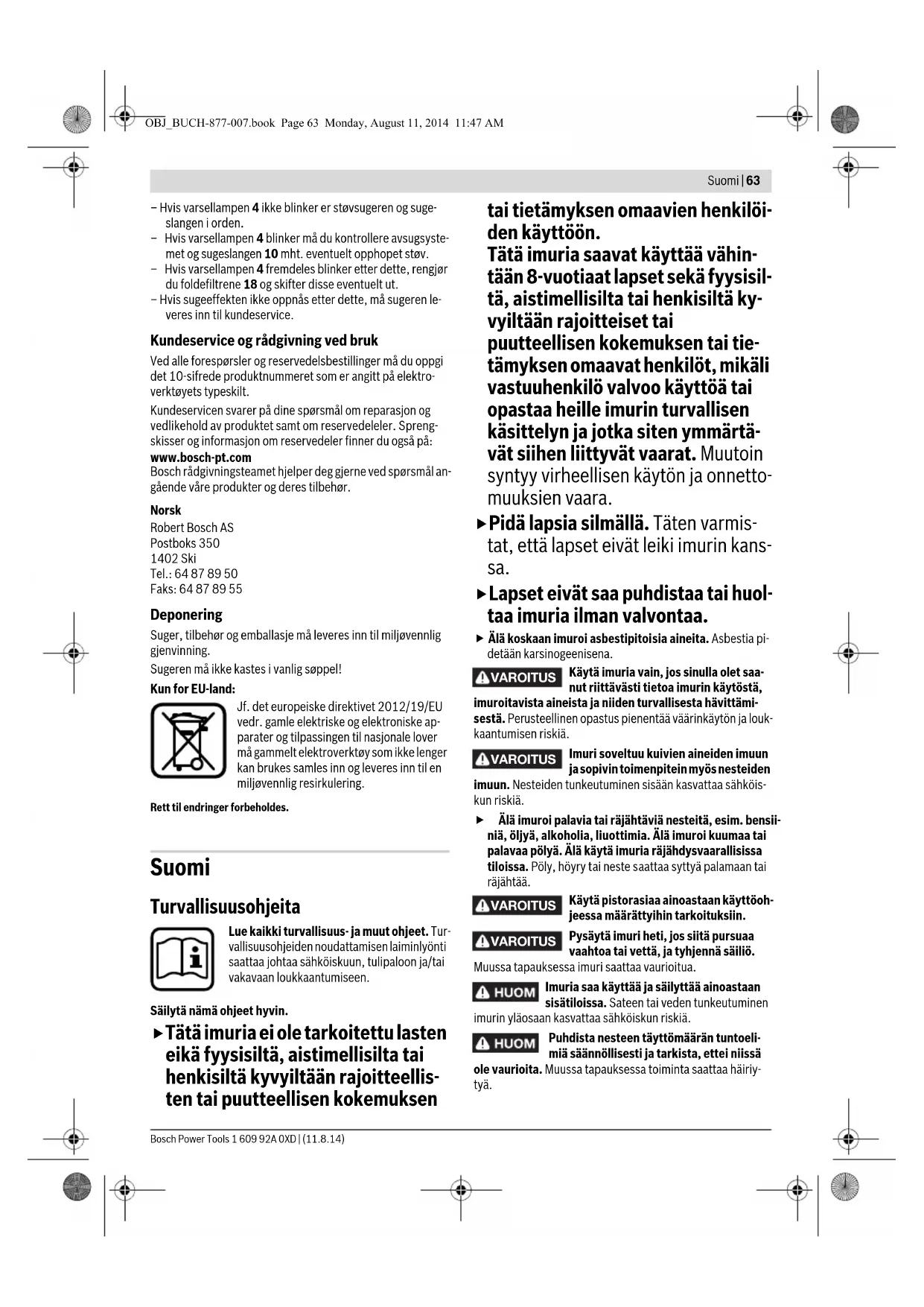 OBJ_BUCH-877-007.book Page 62 Monday, August 11, 2014 11:47 AMSuomi | 63Bosch Power Tools 1 609 92A 0XD | (11.8.14)– Hvis varsellampen 4 ikke blinker er støvsugeren og suge-slangen i orden. – Hvis varsellampen 4 blinker må du kontrollere avsugsyste- met og sugeslangen 10 mht. eventuelt opphopet støv. – Hvis varsellampen 4 fremdeles blinker etter dette, rengjør du foldefiltrene 18 og skifter disse eventuelt ut.– Hvis sugeeffekten ikke oppnås etter dette, må sugeren le-veres inn til kundeservice. Kundeservice og rådgivning ved bruk Ved alle forespørsler og reservedelsbestillinger må du oppgi det 10-sifrede produktnummeret som er angitt på elektro-verktøyets typeskilt.Kundeservicen svarer på dine spørsmål om reparasjon og vedlikehold av produktet samt om reservedeleler. Spreng-skisser og informasjon om reservedeler finner du også på:www.bosch-pt.comBosch rådgivningsteamet hjelper deg gjerne ved spørsmål an-gående våre produkter og deres tilbehør.NorskRobert Bosch ASPostboks 3501402 SkiTel.: 64 87 89 50Faks: 64 87 89 55 Deponering Suger, tilbehør og emballasje må leveres inn til miljøvennlig gjenvinning.Sugeren må ikke kastes i vanlig søppel!Kun for EU-land:Jf. det europeiske direktivet 2012/19/EU vedr. gamle elektriske og elektroniske ap-parater og tilpassingen til nasjonale lover må gammelt elektroverktøy som ikke lenger kan brukes samles inn og leveres inn til en miljøvennlig resirkulering.Rett til endringer forbeholdes. Suomi