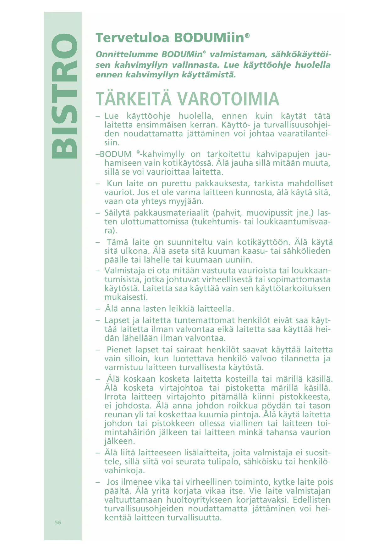 – Lue käyttöohje huolella, ennen kuin käytät tätä laitetta ensimmäisen kerran. Käyttö- ja turvallisuusohjei- den noudattamatta jättäminen voi johtaa vaaratilantei- siin. – BODUM