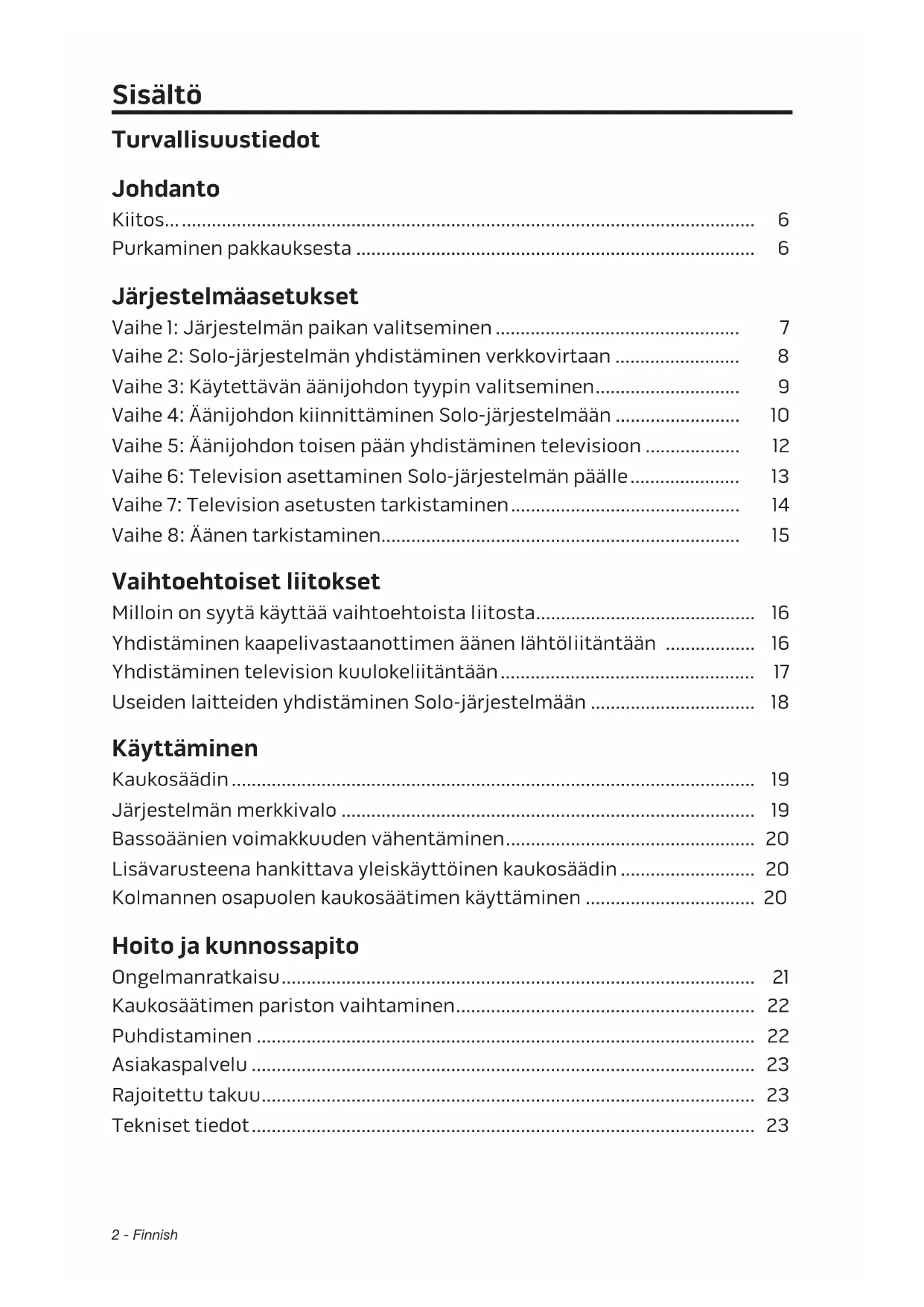 asiakaspalveluun. Yhteystiedot ovat Solo TV -äänijärjestelmän pakkauksessa.