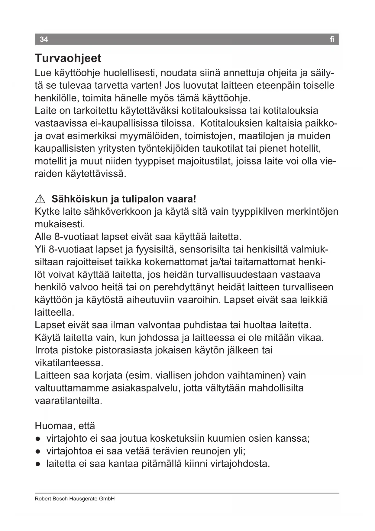 Turvaohjeet Lue käyttöohje huolellisesti, noudata siinä annettuja ohjeita ja säily- tä se tulevaa tarvetta varten! Jos luovutat laitteen eteenpäin toiselle henkilölle, toimita hänelle myös tämä käyttöohje. Laite on tarkoitettu käytettäväksi kotitalouksissa tai kotitalouksia vastaavissa ei-kaupallisissa tiloissa. Kotitalouksien kaltaisia paikko- ja ovat esimerkiksi myymälöiden, toimistojen, maatilojen ja muiden kaupallisisten yritysten työntekijöiden taukotilat tai pienet hotellit, motellit ja muut niiden tyyppiset majoitustilat, joissa laite voi olla vie- raiden käytettävissä.