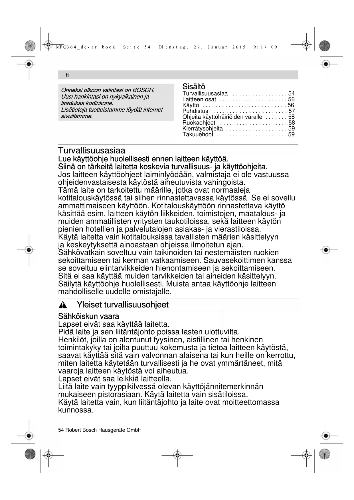 MFQ364_de-ar.book Seite 53 Dienstag, 27. Januar 2015 9:17 0954 Мobert Bosch Вausбeräte БзbВ Нisältö Оurvallisuusasiaa . . . . . . . . . . . . . . . . . 54Жaitteen osat . . . . . . . . . . . . . . . . . . . . . 56Еäуttö . . . . . . . . . . . . . . . . . . . . . . . . . . 56Кuhdistus . . . . . . . . . . . . . . . . . . . . . . . 57Ohдeita käуttöhäiriöiden varalle . . . . . . . 58Мuokaohдeet . . . . . . . . . . . . . . . . . . . . . 58Еierrätуsohдeita . . . . . . . . . . . . . . . . . . . 59Оakuuehdot . . . . . . . . . . . . . . . . . . . . . . 59 Оurvallisuusasiaa