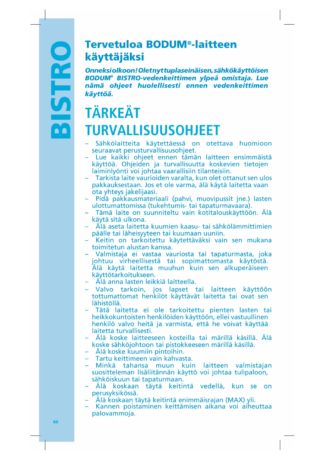 BISTRO-vedenkeittimen ylpeä omistaja. Lue nämä ohjeet huolellisesti ennen vedenkeittimen käyttöä.