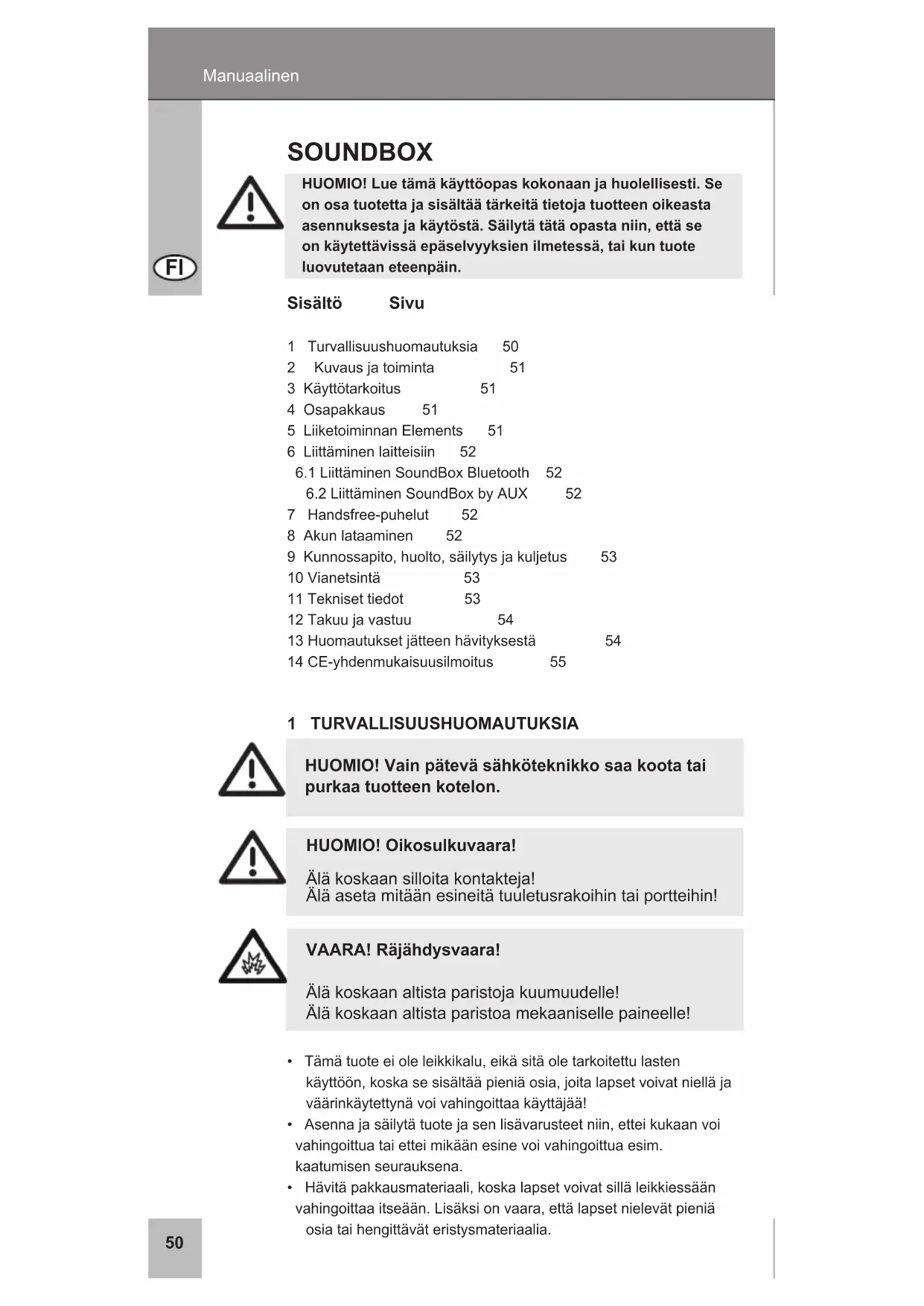 HUOMIO! Lue tämä käyttöopas kokonaan ja huolellisesti. Se on osa tuotetta ja sisältää tärkeitä tietoja tuotteen oikeasta asennuksesta ja käytöstä. Säilytä tätä opasta niin, että se on käytettävissä epäselvyyksien ilmetessä, tai kun tuote luovutetaan eteenpäin. SOUNDBOX Sisältö Sivu 1 Turvallisuushuomautuksia 50 2 Kuvausjatoiminta 51 3Käyttötarkoitus 51 4 Osapakkaus 51 5 Liiketoiminnan Elements 51 6 Liittäminen laitteisiin 52