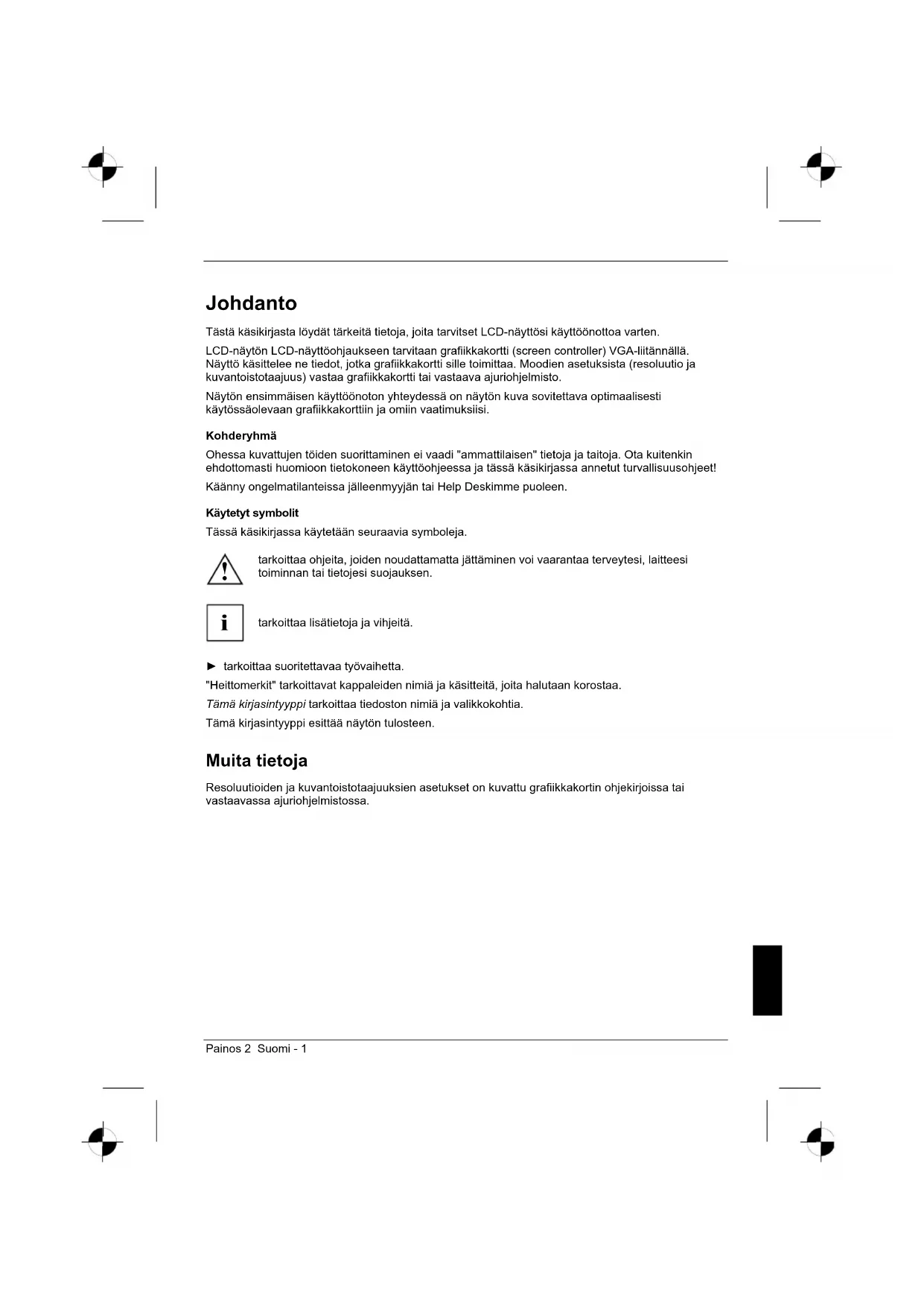 Tästä käsikirjasta löydät tärkeitä tietoja, joita tarvitset LCD-näyttösi käyttöönottoa varten.
