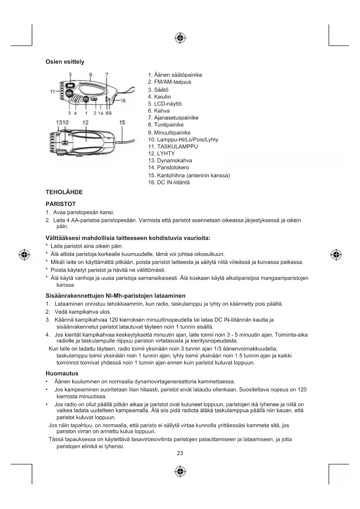 - Laitetta ei tule altistaa roiskeille eikä pisaroille, eikä sen päälle saa asettaa nestettä sisältäviä esineitä, kuten esimerkiksi maljakoita. TEKNISET TIEDOT Virtalähde: DC 12V, 250mA (4 x C-kokoista kuivaparistoa) Sisäänrakennetut Ni-Mh ladattavat paristot Kampeamisvirtageneraattori Taajuusalue: FM: 88 - 108 MHz AM: 530 - 1710 KHz Kaiutinimpedanssi: 8 ohm, 0.5 W Kaiuttimen ulostulo: 150mW (R.M.S.)