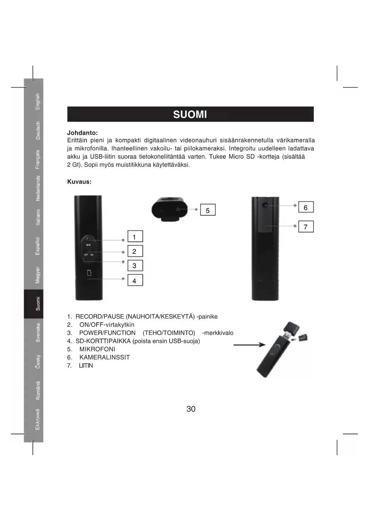 1. Poista USB-suoja ja aseta Micro SD -kortti (4) paikoilleen. Aseta Micro SD -kortti