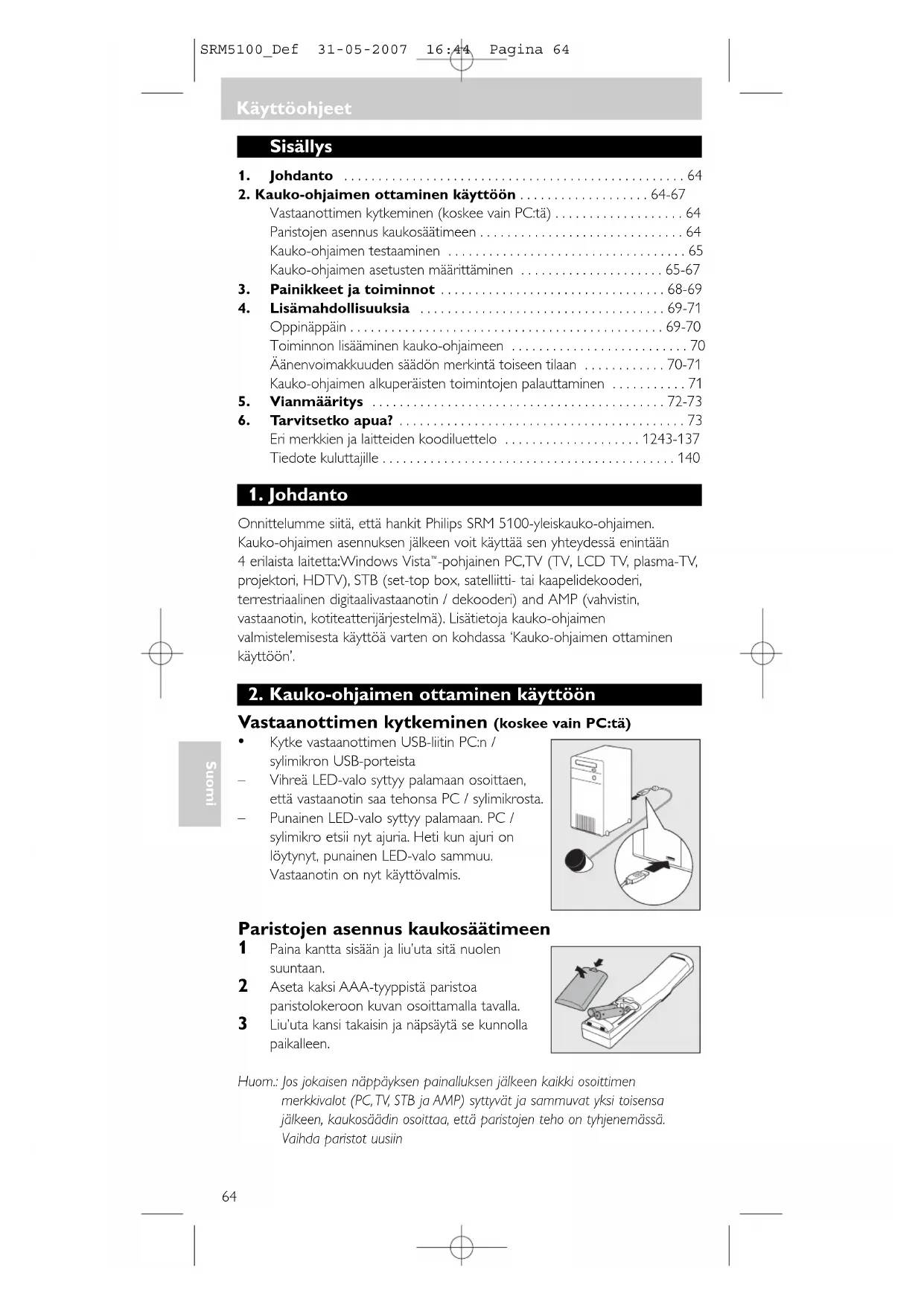 2. Kauko-ohjaimen ottaminen käyttöön . . . . . . . . . . . . . . . . . . . 64-67