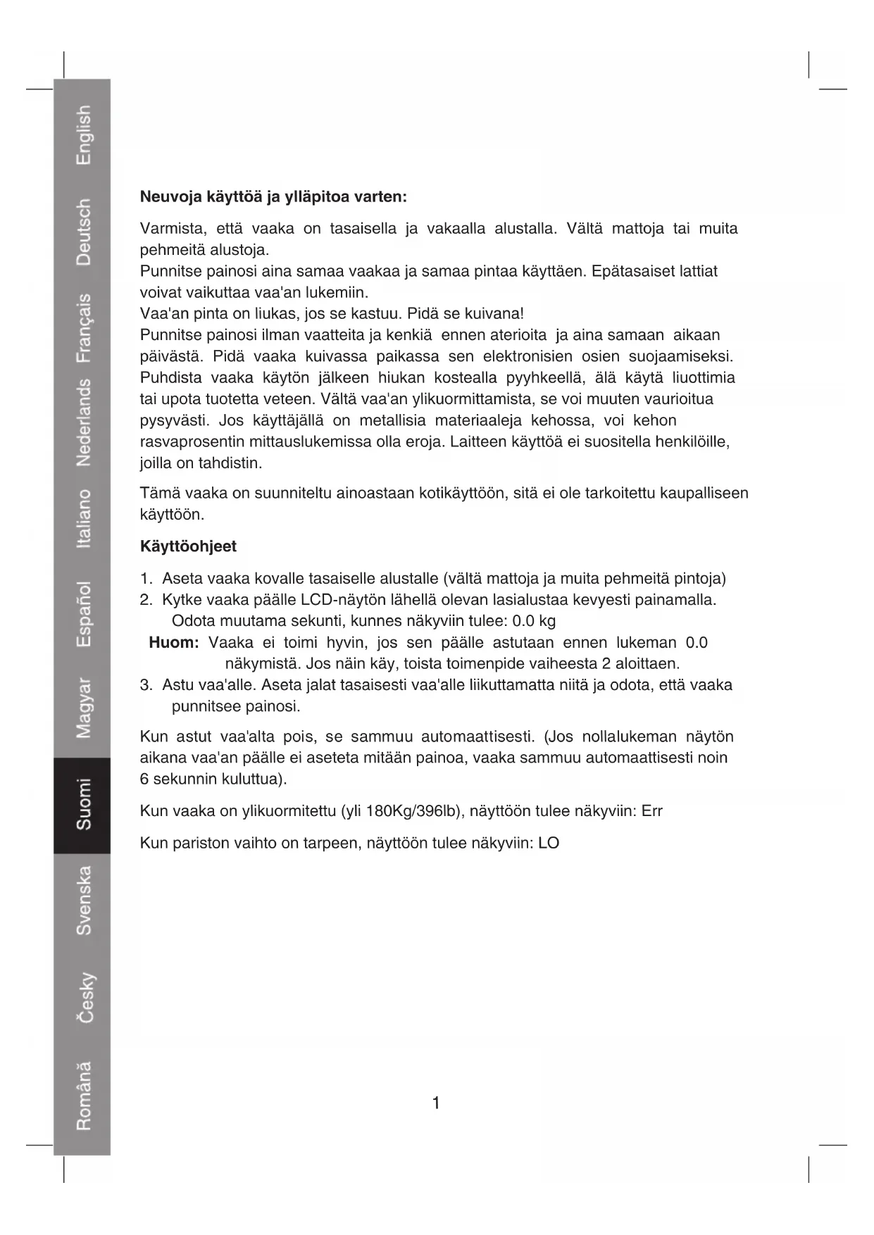 Tämä vaaka on suunniteltu ainoastaan kotikayttoön, sitä ei ole tarkoitettu kaupalliseen käyttoön.