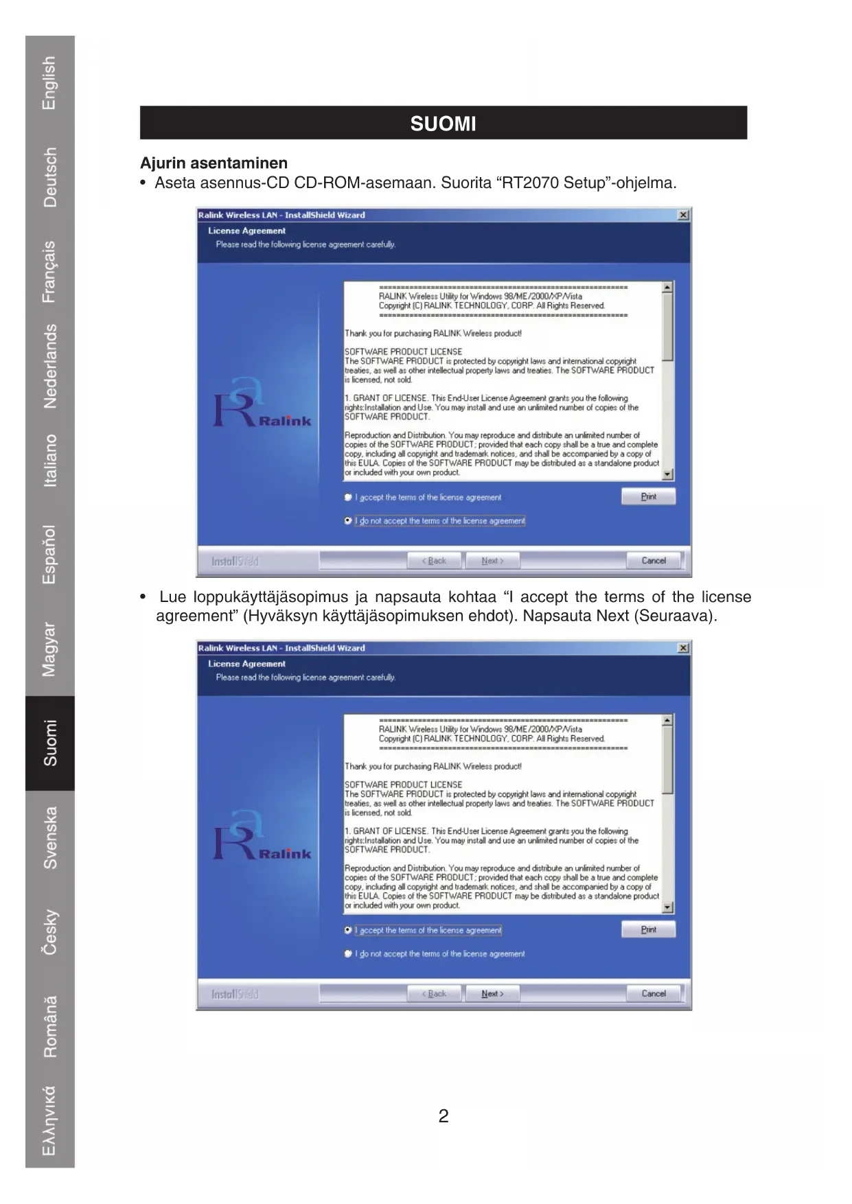 - Aseta asennus-CD CD-ROM-asemaan. Suorita "RT2070 Setup"-ohjelma.