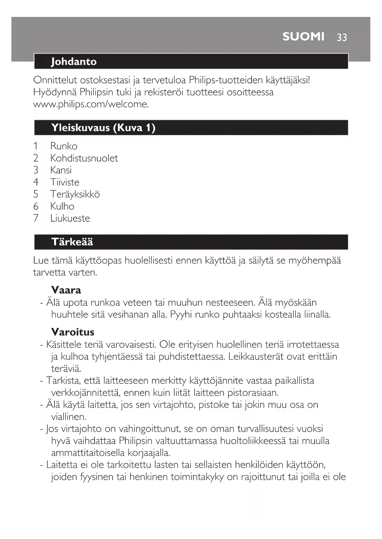 Albaricoques secos 100 g 5 segundos Queso 100 - 150 g 5 - 10 pulsaciones Frutos secos 100 - 200 g 5 - 10 pulsaciones Frutas 250 - 300 g 5 - 10 pulsaciones Comida para bebé 250 - 300 g 5 - 10 pulsaciones 3 Coloquelatapasobreelrecipiente(g.4). 4 Coloquelaunidadmotorasobrelatapa(g.5). Asegúrese de que las echas de posición de la tapa y de la unidad motora estén unas frente a otras. 5 Presione la unidad motora hacia abajo para iniciar el proceso de picado. El aparato funciona mientras se mantiene la unidad motora presionada hacia abajo. - Cuando pique ingredientes blandos (por ejemplo, cebollas, perejil o magro de ternera), le aconsejamos que presione la unidad motora varias veces seguidas durante poco tiempo (pulsaciones). Para 1 pulsación, pulse el botón turbo durante un segundo y suéltelo durante 1 segundo. ESPAÑOL30Limpieza No utilice estropajos, agentes abrasivos ni líquidos agresivos, como alcohol, gasolina o acetona, para limpiar el aparato. No sumerja nunca la unidad motora en agua ni la lave en el lavavajillas. 1 Desenchufe y desmonte el aparato. Para una limpieza más a fondo, también puede extraer el aro de cierre y el aro antideslizante. 2 Lave el recipiente, la tapa, la unidad de cuchillas, el aro de cierre y el aro antideslizante en el lavavajillas o con agua caliente y un poco de detergente líquido. 3 Limpie la unidad motora con un paño húmedo. Medio ambiente - Al nal de su vida útil, no tire el aparato junto con la basura normal del hogar. Llévelo a un punto de recogida ocial para su reciclado. De esta manera, ayudará a conservar el medio ambiente (g. 6). Garantía y servicio Si necesita información o tiene algún problema, visite la página Web de Philips en www.philips.com o póngase en contacto con el Servicio de Atención al Cliente de Philips en su país. Hallará el número de teléfono en el folleto de la garantía mundial. Si no hay Servicio de Atención al Cliente de Philips en su país, diríjase a su distribuidor local Philips. Preguntas más frecuentes En este capítulo encontrará las preguntas más frecuentes sobre el aparato. Si no encuentra la respuesta a su pregunta, póngase en contacto con el Servicio de Atención al Cliente de su país. ESPAÑOL 31Pregunta Respuesta ¿Puedo lavar todas las piezas en el lavavajillas? Sí, excepto la unidad motora. ¿Puedo echar líquidos hirviendo en el recipiente? No, deje que los líquidos se enfríen hasta 80 °C/175 °F. ¿Por qué desprende el motor un olor desagradable durante el funcionamiento? Es muy normal que el aparato desprenda un olor desagradable o eche un poco de humo las primeras veces que se utiliza. Este fenómeno cesará cuando haya utilizado el aparato unas cuantas veces. También es posible que desprenda un olor desagradable o eche humo si se utiliza durante mucho tiempo seguido. En este caso, deje de utilizar el aparato y deje que se enfríe durante 60 minutos. El aparato ha dejado de funcionar porque la unidad de cuchillas está bloqueada. ¿Qué debo hacer? Quite la unidad motora y la tapa del aparato. Utilice una espátula para retirar los ingredientes que estén bloqueando la unidad de cuchillas. También es posible que deba procesar cantidades más pequeñas. La picadora no funciona al presionar la unidad motora hacia abajo ¿qué debo hacer? Compruebe que la unidad motora está correctamente colocada en la tapa. Las echas de posición de la tapa y las de la unidad motora deben estar unas frente a otras. Español3233 Johdanto Onnittelut ostoksestasi ja tervetuloa Philips-tuotteiden käyttäjäksi! Hyödynnä Philipsin tuki ja rekisteröi tuotteesi osoitteessa www.philips.com/welcome. Yleiskuvaus (Kuva 1) 1 Runko 2 Kohdistusnuolet 3 Kansi 4 Tiiviste 5 Teräyksikkö 6 Kulho 7 Liukueste Tärkeää Lue tämä käyttöopas huolellisesti ennen käyttöä ja säilytä se myöhempää tarvetta varten. Vaara - Älä upota runkoa veteen tai muuhun nesteeseen. Älä myöskään huuhtele sitä vesihanan alla. Pyyhi runko puhtaaksi kostealla liinalla. Varoitus - Käsittele teriä varovaisesti. Ole erityisen huolellinen teriä irrotettaessa ja kulhoa tyhjentäessä tai puhdistettaessa. Leikkausterät ovat erittäin teräviä. - Tarkista, että laitteeseen merkitty käyttöjännite vastaa paikallista verkkojännitettä, ennen kuin liität laitteen pistorasiaan. - Älä käytä laitetta, jos sen virtajohto, pistoke tai jokin muu osa on viallinen. - Jos virtajohto on vahingoittunut, se on oman turvallisuutesi vuoksi hyvä vaihdattaa Philipsin valtuuttamassa huoltoliikkeessä tai muulla ammattitaitoisella korjaajalla. - Laitetta ei ole tarkoitettu lasten tai sellaisten henkilöiden käyttöön, joiden fyysinen tai henkinen toimintakyky on rajoittunut tai joilla ei ole SUOMIkokemusta tai tietoa laitteen käytöstä, muuten kuin heidän turvallisuudestaan vastaavan henkilön valvonnassa ja ohjauksessa. - Pienten lasten ei saa antaa leikkiä laitteella. - Älä anna lasten käyttää teholeikkuria ilman valvontaa. Varoitus - Varo ylittämästä taulukossa annettuja määriä ja valmistusaikoja. - Pilko isot ainesosat noin 2 cm:n kappaleiksi ennen käsittelyä. - Älä kaada kulhoon kuumia, yli 80-asteisia aineita. - Jos ainekset tarttuvat kulhon sisäpintaan, irrota runko, avaa kansi ja irrota ainekset lastalla tai lisää vähän nestettä. - Älä koskaan käytä muita kuin Philipsin valmistamia tai suosittelemia lisävarusteita tai -osia. Jos käytät muita osia, takuu ei ole voimassa. - Tämä laite on tarkoitettu vain kotitalouksien käyttöön. Sähkömagneettiset kentät (EMF) Tämä Philips-laite vastaa kaikkia, sähkömagneettisia kenttiä (EMF) koskevia standardeja. Jos laitetta käytetään oikein ja tämän käyttöohjeen ohjeiden mukaisesti, sen käyttäminen on turvallista tämänhetkisen tutkimustiedon perusteella. Käyttöönotto - Puhdista hyvin kaikki ruoan kanssa kosketuksiin joutuvat osat ennen laitteen käyttöönottoa (katso kohtaa Puhdistaminen). Käyttö 1 Aseta teräyksikkö k