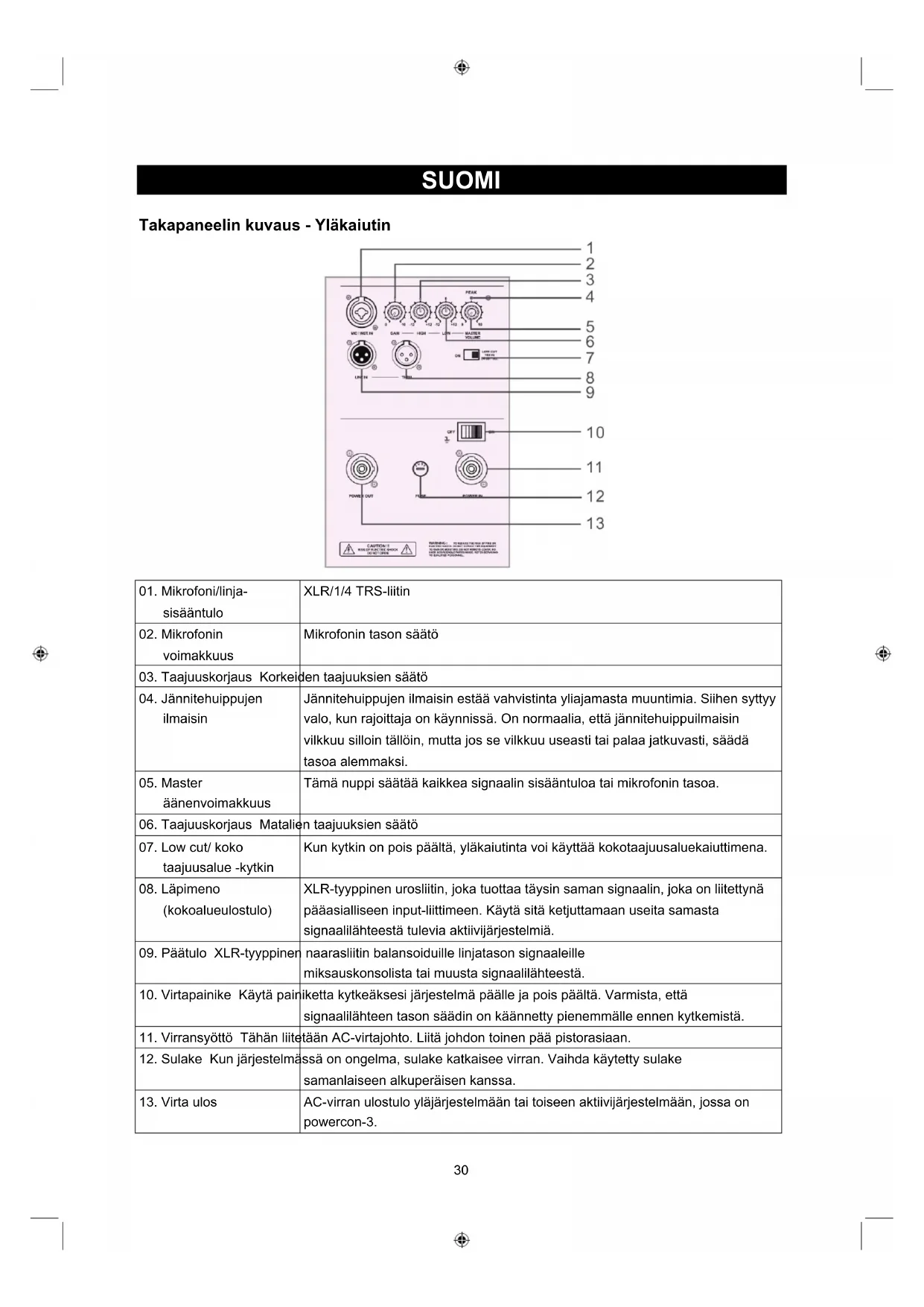 (kokoalueulostulo) XLR-tyyppinen urosliitin, joka tuottaa täysin saman signaalin, joka on liitettynä pääasialliseen input-liittimeen. Käytä sitä ketjuttamaan useita samasta signaalilähteestä tulevia aktiivijärjestelmiä.