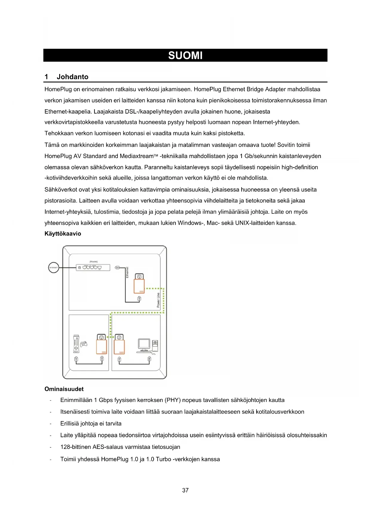 36SUOMI HomePlug 1 Johdanto HomePlug on erinomainen ratkaisu verkkosi jakamiseen. HomePlug Ethernet Bridge Adapter mahdollistaa verkon jakamisen useiden eri laitteiden kanssa niin kotona kuin pienikokoisessa toimistorakennuksessa ilman Ethernet-kaapelia. Laajakaista DSL-/kaapeliyhteyden avulla jokainen huone, jokaisesta verkkovirtapistokkeella varustetusta huoneesta pystyy helposti luomaan nopean Internet-yhteyden. Tehokkaan verkon luomiseen kotonasi ei vaadita muuta kuin kaksi pistoketta. Tämä on markkinoiden korkeimman laajakaistan ja matalimman vasteajan omaava tuote! Sovitin toimii HomePlug AV Standard and Mediaxtream
