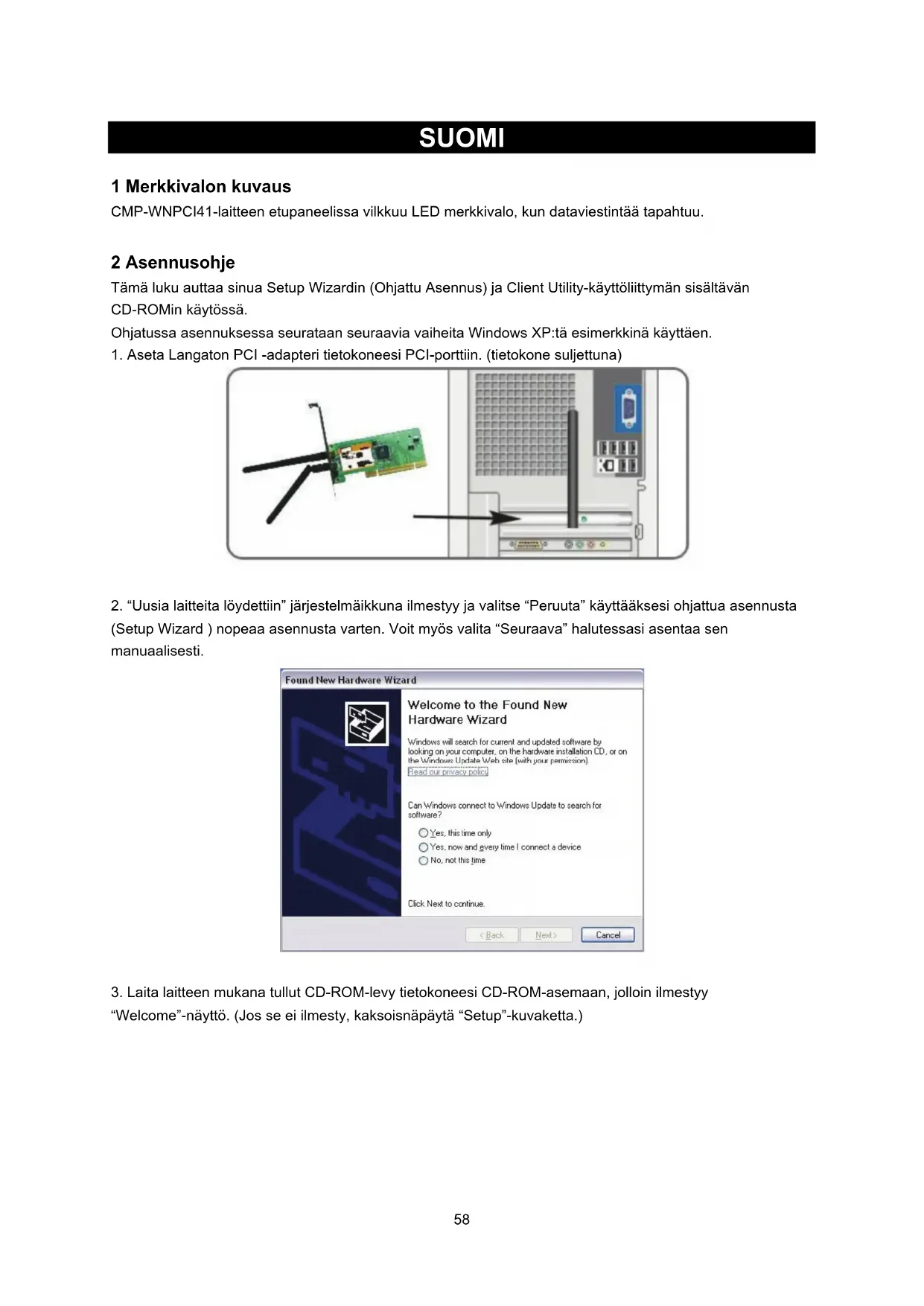 PIN: Syötä pin-koodi ja näpäytä “PIN” yhdistääksesi automaattisesti langaton adapteri paikallisiin langattomiin laitteisiin. PBC: Näpäytä “PBC” viedäksesi loppuun langattoman adapterin ja toisen langattoman laitteen välillä tehtävä automaattinen tarkastustoiminto. Renew (Päivitys): Pin-koodin päivittäminen. Rescan (Uudelleenkartoittaminen): WPS-yhteensopivien paikallisten langattomien verkkojen uudelleenkartoittaminen. Disconnect (Katkaise yhteys): Yhdistetyn langattoman verkon yhteyden katkaiseminen.65 Takuu: Takuu ja vastuuvelvollisuus mitätöityvät, jos tuote vaurioituu siihen tehtyjen muutoksien tai sen väärinkäytön takia. Yleistä: Muutoksia malliin ja teknisiin ominaisuuksiin voidaan tehdä ilmoituksetta. Kaikki logot, merkit ja tuotenimet ovat niiden vastaavien omistajien tuotemerkkejä tai rekisteröityjä tuotemerkkejä ja niitä on käsiteltävä sellaisina. Säilytä käyttöohjeet ja pakkaus myöhempää käyttötarvetta varten. Huomio: Tuote on varustettu tällä merkillä. Se merkitsee, ettei käytettyjä sähkö- tai elektronisia tuotteita saa hävittää kotitalousjätteen mukana. Kyseisille tuotteille on olemassa erillinen keräysjärjestelmä.66 SVENSKA 300Mps trådlöst nätverkskort 1 Inledande beskrivning På fronten av CMP-WNPC14 finns en blinkande LED-indikering när datakommunikation förekommer. 2 Installationsguide Detta kapitel ska hjälpa dig att använda inklusive CD-skivan som innehåller installationsguiden och användargränssnittet. Följande steg för inställningsguiden är med exempel från Windows XP.