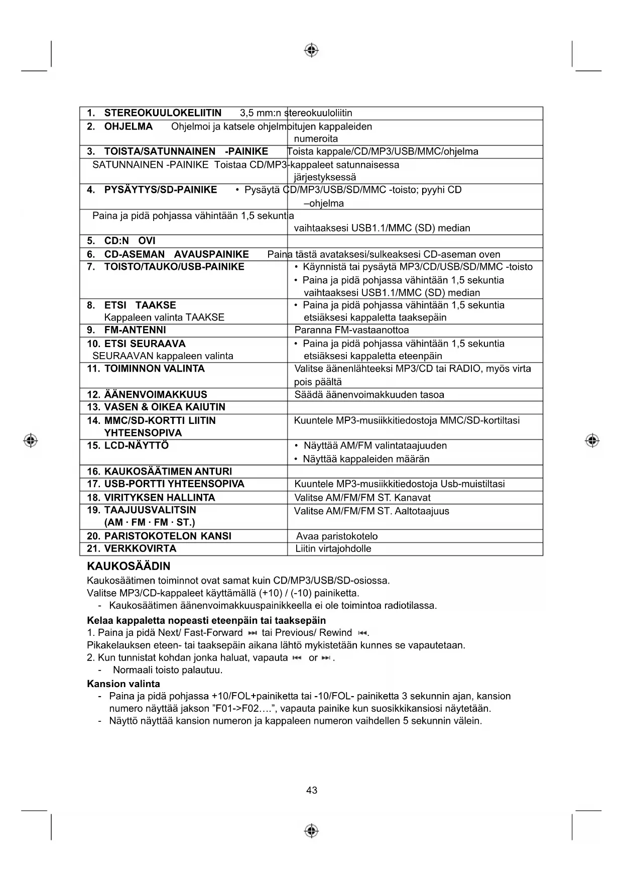 | 17. USB-PORTTI YHTEENSOPIVA | Kuuntele MP3-musiikkitiedostoja Usb-muistiltasi |