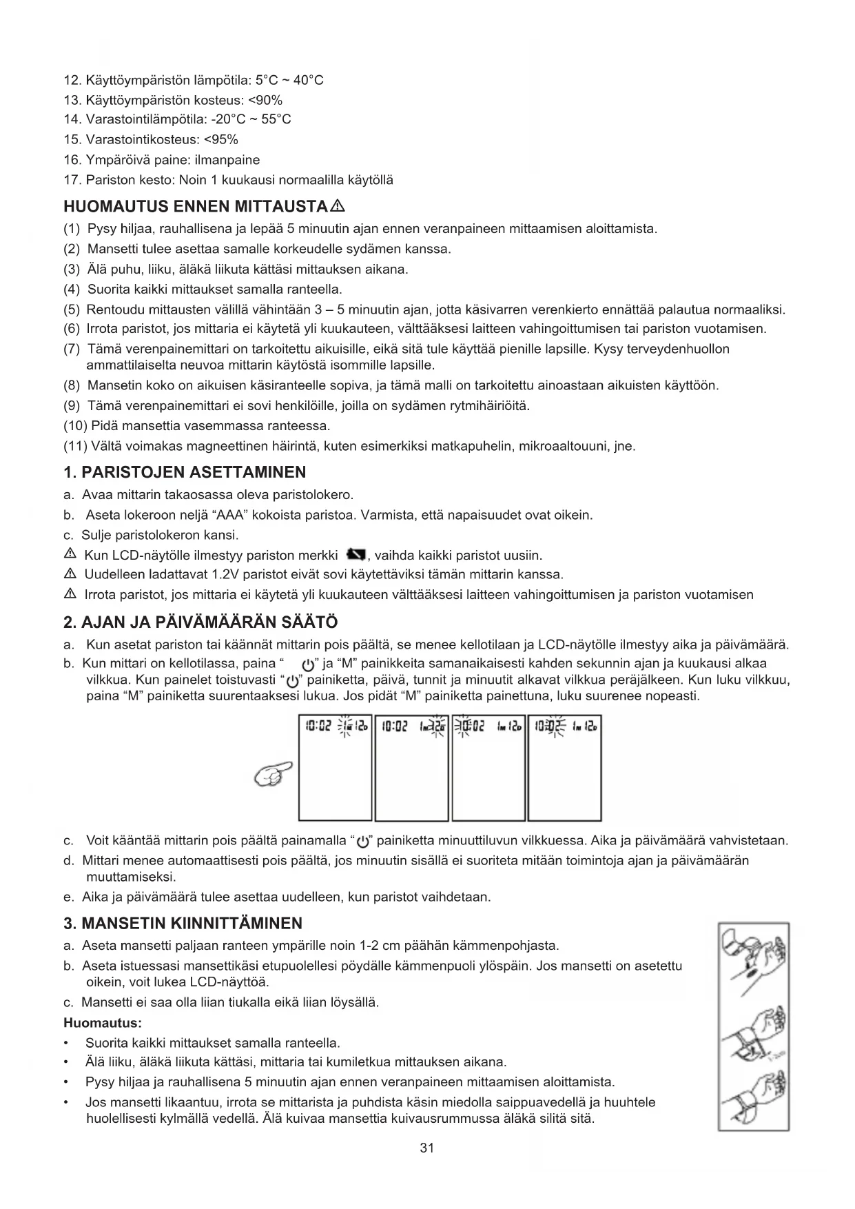 (1) Pysy hiljaa, rauhallisena ja lepää 5 minuutin ajan ennen veranpaineen mittaamisen aloittamista. (2) Mansetti tulee asettaa samalle korkeudelle sydämen kanssa. (3) Älä puhu, liiku, äläkä liikuta kättäsi mittauksen aikana. (4) Suorita kaikki mittaukset samalla ranteella. (5) Rentoudu mittausten välillä vähintään 3 – 5 minuutin ajan, jotta käsivarren verenkierto ennättää palautua normaaliksi. (6) Irrota paristot, jos mittaria ei käytetä yli kuukauteen, välttääksesi laitteen vahingoittumisen tai pariston vuotamisen. (7) Tämä verenpainemittari on tarkoitettu aikuisille, eikä sitä tule käyttää pienille lapsille. Kysy terveydenhuollon ammattilaiselta neuvoa mittarin käytöstä isommille lapsille. (8) Mansetin koko on aikuisen käsiranteelle sopiva, ja tämä malli on tarkoitettu ainoastaan aikuisten käyttöön. (9) Tämä verenpainemittari ei sovi henkilöille, joilla on sydämen rytmihäiriöitä. (10) Pidä mansettia vasemmassa ranteessa. (11) Vältä voimakas magneettinen häirintä, kuten esimerkiksi matkapuhelin, mikroaaltouuni, jne.