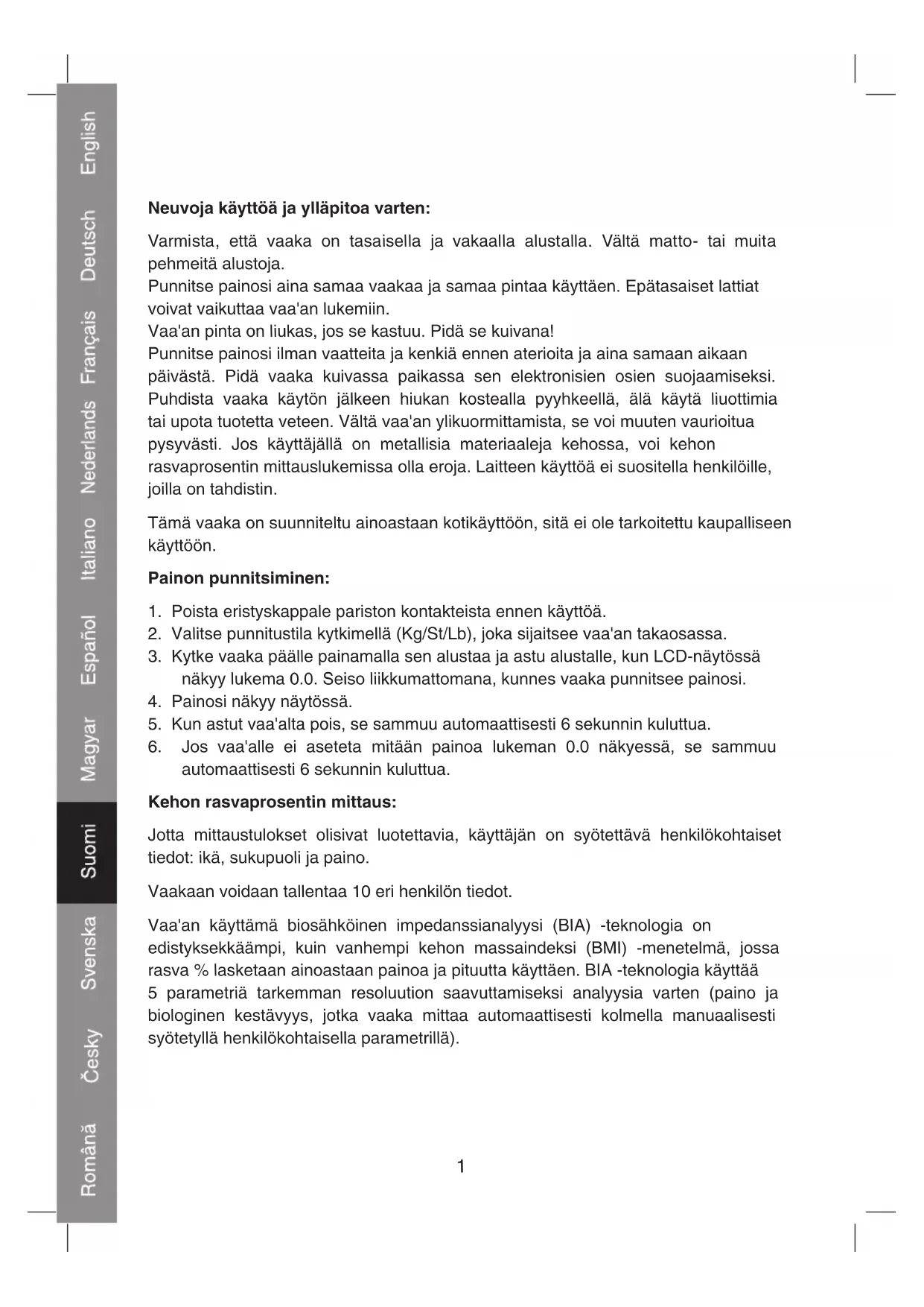 Henkilövaaka1 Neuvoja käyttöä ja ylläpitoa varten: Varmista, että vaaka on tasaisella ja vakaalla alustalla. Vältä matto- tai muita pehmeitä alustoja. Punnitse painosi aina samaa vaakaa ja samaa pintaa käyttäen. Epätasaiset lattiat voivat vaikuttaa vaa'an lukemiin. Vaa'an pinta on liukas, jos se kastuu. Pidä se kuivana! Punnitse painosi ilman vaatteita ja kenkiä ennen aterioita ja aina samaan aikaan päivästä. Pidä vaaka kuivassa paikassa sen elektronisien osien suojaamiseksi. Puhdista vaaka käytön jälkeen hiukan kostealla pyyhkeellä, älä käytä liuottimia tai upota tuotetta veteen. Vältä vaa'an ylikuormittamista, se voi muuten vaurioitua pysyvästi. Jos käyttäjällä on metallisia materiaaleja kehossa, voi kehon rasvaprosentin mittauslukemissa olla eroja. Laitteen käyttöä ei suositella henkilöille, joilla on tahdistin. Tämä vaaka on suunniteltu ainoastaan kotikäyttöön, sitä ei ole tarkoitettu kaupalliseen käyttöön. Painon punnitsiminen: