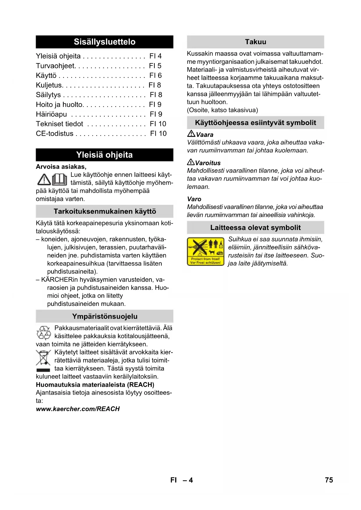 89 dB(A) Försäkran om EU- överensstämmelse Produkt: Högtryckstvätt Typ: 1.674-xxx Tillämpliga EU-direktiv 2006/42/EG (+2009/127/EG) 2004/108/EG 2000/14/EG Tillämpade harmoniserade normer EN 55014–1: 2006 + A1: 2009 EN 55014–2: 1997 + A2: 2008 EN 60335–1 EN 60335–2–79 EN 61000–3–2: 2006 + A2: 2009 EN 61000–3–3: 2008 EN 62233: 2008 Tillämpad metod för överensstämmelsevärdering 2000/14/EG: Bilaga V Ljudeffektsnivå dB(A) Upmätt: 86 Garantterad: 89 CEO Head of Approbation 74 SV– 4 Arvoisa asiakas, Lue käyttöohje ennen laitteesi käyt- tämistä, säilytä käyttöohje myöhem- pää käyttöä tai mahdollista myöhempää omistajaa varten. Käytä tätä korkeapainepesuria yksinomaan koti- talouskäytössä: – koneiden, ajoneuvojen, rakennusten, työka- lujen, julkisivujen, terassien, puutarhaväli- neiden jne. puhdistamista varten käyttäen korkeapainesuihkua (tarvittaessa lisäten puhdistusaineita). – KÄRCHERin hyväksymien varusteiden, va- raosien ja puhdistusaineiden kanssa. Huo- mioi ohjeet, jotka on liitetty puhdistusaineiden mukaan. Pakkausmateriaalit ovat kierrätettäviä. Älä käsittelee pakkauksia kotitalousjätteenä, vaan toimita ne jätteiden kierrätykseen. Käytetyt laitteet sisältävät arvokkaita kier- rätettäviä materiaaleja, jotka tulisi toimit- taa kierrätykseen. Tästä syystä toimita kuluneet laitteet vastaaviin keräilylaitoksiin. Huomautuksia materiaaleista (REACH) Ajantasaisia tietoja ainesosista löytyy osoittees- ta: www.kaercher.com/REACH Kussakin maassa ovat voimassa valtuuttamam- me myyntiorganisaation julkaisemat takuuehdot. Materiaali- ja valmistusvirheistä aiheutuvat vir- heet laitteessa korjaamme takuuaikana maksut- ta. Takuutapauksessa ota yhteys ostotositteen kanssa jälleenmyyjään tai lähimpään valtuutet- tuun huoltoon. (Osoite, katso takasivua) Vaara Välittömästi uhkaava vaara, joka aiheuttaa vaka- van ruumiinvamman tai johtaa kuolemaan. 몇 Varoitus Mahdollisesti vaarallinen tilanne, joka voi aiheut- taa vakavan ruumiinvamman tai voi johtaa kuo- lemaan. Varo Mahdollisesti vaarallinen tilanne, joka voi aiheuttaa lievän ruumiinvamman tai aineellisia vahinkoja. Suihkua ei saa suunnata ihmisiin, eläimiin, jännitteellisiin sähköva- rusteisiin tai itse laitteeseen. Suo- jaa laite jäätymiseltä. Sisällysluettelo Yleisiä ohjeita . . . . . . . . . . . . . . . . FI 4 Turvaohjeet. . . . . . . . . . . . . . . . . . FI 5 Käyttö . . . . . . . . . . . . . . . . . . . . . . FI 6 Kuljetus. . . . . . . . . . . . . . . . . . . . . FI 8 Säilytys . . . . . . . . . . . . . . . . . . . . . FI 8 Hoito ja huolto. . . . . . . . . . . . . . . . FI 9 Häiriöapu . . . . . . . . . . . . . . . . . . . FI 9 Tekniset tiedot . . . . . . . . . . . . . . . FI 10 CE-todistus . . . . . . . . . . . . . . . . . . FI 10 Yleisiä ohjeita Tarkoituksenmukainen käyttö Ympäristönsuojelu Takuu Käyttöohjeessa esiintyvät symbolit Laitteessa olevat symbolit 75FI– 5 Vaara Älä koskaan tartu märillä käsillä virtapistok- keeseen. Älä ota laitetta käyttöön, jos verkkojohto tai laitteen tärkeät osat, esim. korkeapainelet- ku, suihkupistooli (-kahva) tai turvalaitteet ovat vaurioituneet. Tarkasta aina ennen käyttöä, että sähkökaa- peli ja verkkopistoke ovat ehjät. Anna valtuute- tun huollon/sähköalan ammattilaisen välittömästi vaihtaa vaurioitunut sähkökaapeli. Tarkasta korkeapaineletkun kunto aina en- nen käyttöä. Vaihda vaurioitunut korkeapai- neletku välittömästi. Käyttö räjähdysalttiilla alueilla on kielletty. Käytettäessä laitetta vaara-alueilla (esim. huoltoasemilla) on noudatettava vastaavia turvallisuusmääräyksiä. Epäasianmukaisesti käytettyinä korkeapai- nesuihkut voivat olla vaarallisia. Suihkua ei saa suunnata ihmisiin, eläimiin, aktiivisiin sähkövarusteisiin tai itse laitteeseen. Älä suuntaa korkeapainesuihkua muihin ih- misiin tai itseesi vaatteiden tai kenkien puh- distamiseksi. Älä ruiskuta esineitä, jotka sisältävät tervey- delle haitallisia aineita (esim. asbesti). Korkeapainesuihku voi vaurioittaa ajoneu- von renkaita/renkaiden venttiilejä, jolloin ne saattavat puhjeta. Ensimmäinen merkki siitä on renkaan värin muuttuminen. Vaurioitu- neet ajoneuvon renkaat/ renkaiden venttiilit ovat hengenvaarallisia. Pidä puhdistuksessa vähintään 30 cm suihkutusetäisyys! Räjähdysvaara! Älä suihkuta mitään palavia nesteitä. Älä koskaan ime liuotinpitoisia nesteitä tai lai- mentamattomia happoja tai liuottimia! Niihin kuuluvat esim. bensiini, värinohennusaineet tai polttoöljy. Ruiskutussumu on erittäin herkästi syttyvää, helposti räjähtävää ja myrkyllistä. Älä käytä asetonia, laimentamattomia happoja eikä liuottimia, koska ne syövyttävät laitteessa käytettyjä materiaaleja. 몇 Varoitus Verkkojohdon ja jatkojohdon liittimen on oltava vesitiiviitä, eivätkä ne saa maata vedessä. Tarkoitukseen sopimattomat jatkojohdot voi- vat olla vaarallisia. Käytä ulkona vain tarkoi- tukseen hyväksyttyjä ja vastaavasti merkittyjä jatkojohtoja, joissa on riittävä joh- don poikkileikkaus.