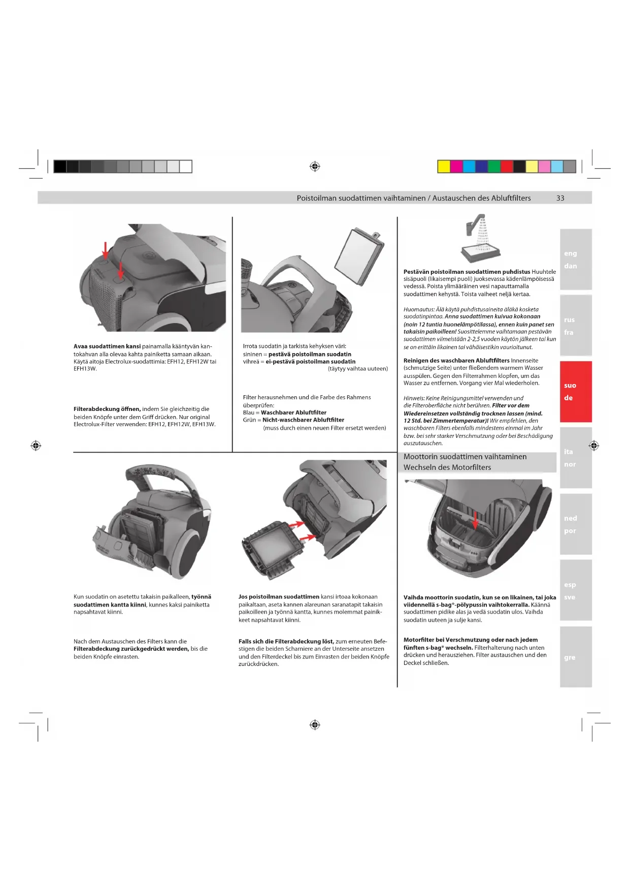 • Jos olet jo vaihtanut s-bag®-pölypussin, vaihda moottorin suodatin.