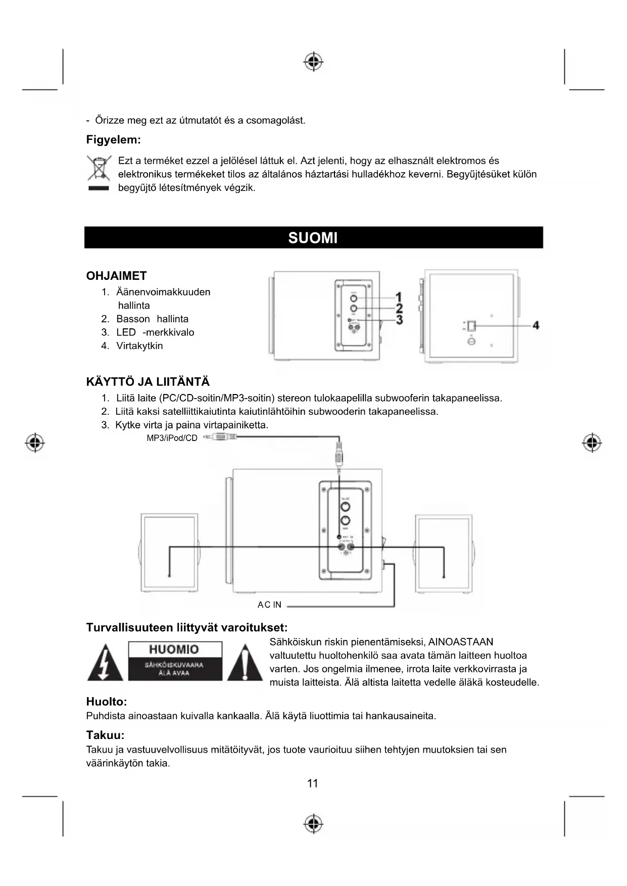 Turvallisuuteen liittyvät varoitukset: Sähköiskun riskin pienentämiseksi, AINOASTAAN valtuutettu huoltohenkilö saa avata tämän laitteen huoltoa varten. Jos ongelmia ilmenee, irrota laite verkkovirrasta ja muista laitteista. Älä altista laitetta vedelle äläkä kosteudelle. Huolto: Puhdista ainoastaan kuivalla kankaalla. Älä käytä liuottimia tai hankausaineita. Takuu: Takuu ja vastuuvelvollisuus mitätöityvät, jos tuote vaurioituu siihen tehtyjen muutoksien tai sen väärinkäytön takia.