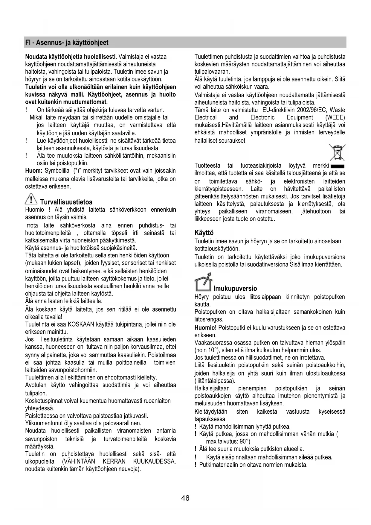 haitoista, vahingoista tai tulipaloista. Tuuletin imee savun ja