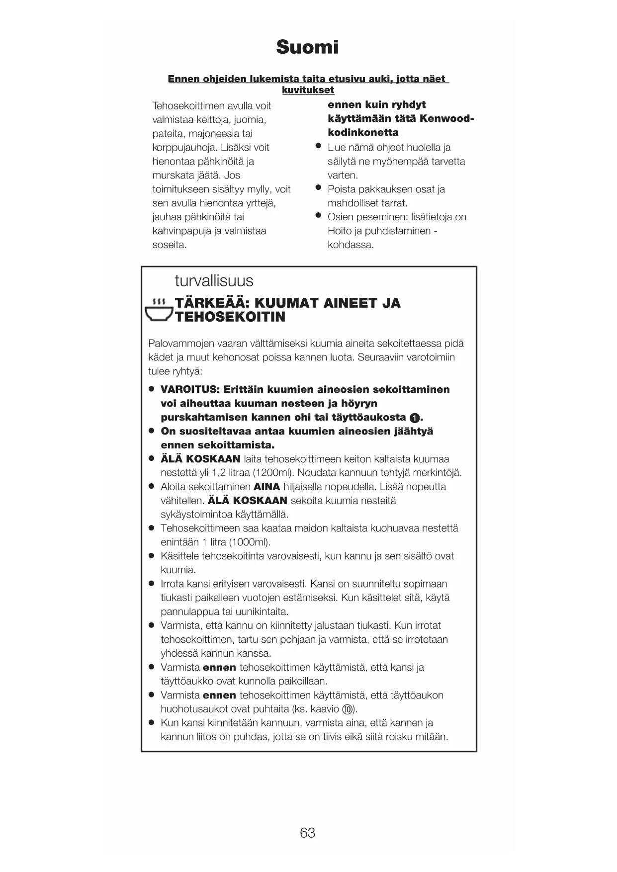 TÄRKEÄÄ: KUUMAT AINEET JA TEHOSEKOITIN Palovammojen vaaran välttämiseksi kuumia aineita sekoitettaessa pidä