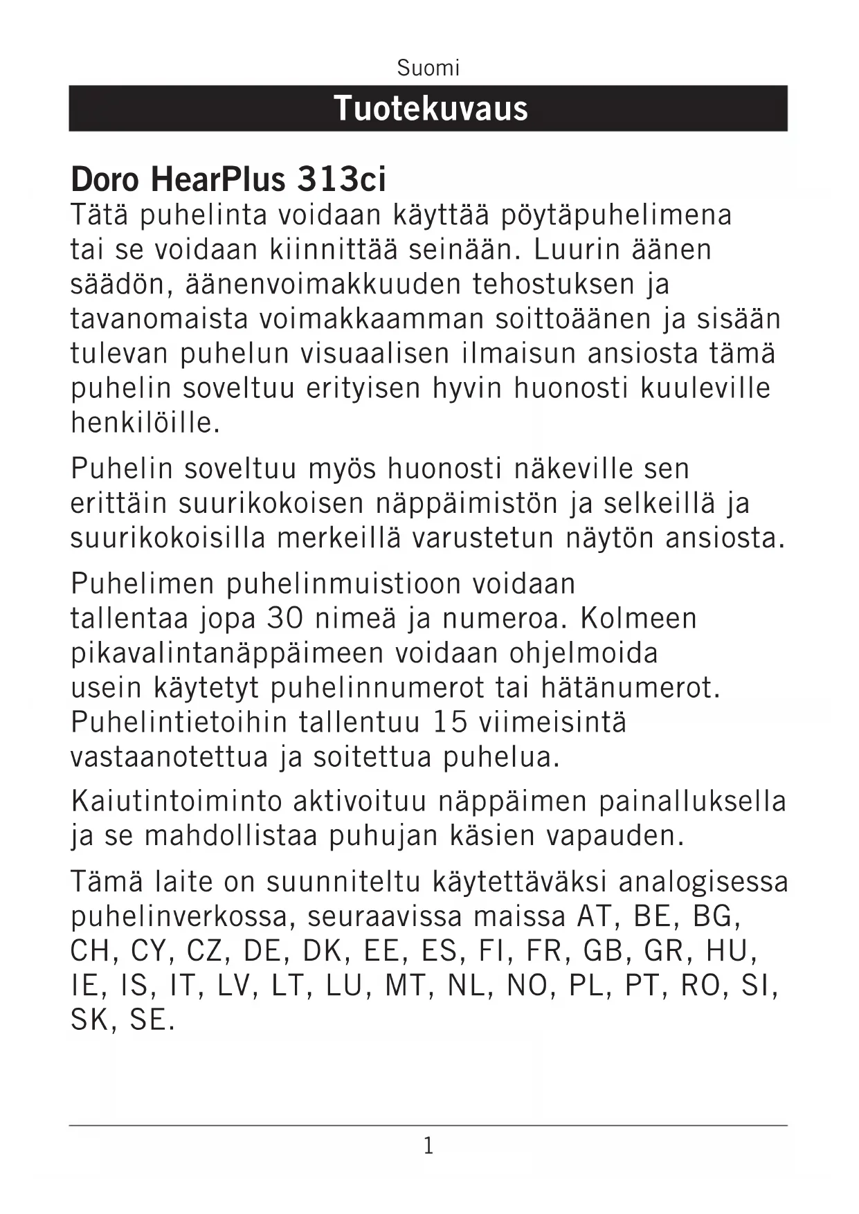 - Verkkovirtasovitin on irtikytkentälaite tuotteen ja verkkovirran välillä. Sähköpistorasian on sijaittava laitteen lähellä ja siihen on oltava helppo pääsy. Nämä neuvot koskevat puhelinta, akkua, verkkovirta-adapteria ja muita varusteita. Jos puhelin ei toimi oikein, ota yhteys laitteen ostopaikkaan. Takuuhuolto suoritetaan vain alkuperäistä kuittia tai laskukopiota vastaan.16 Suomi Takuu ja tekniset tiedot Tällä laitteella on yhden vuoden DORO-takuu. Mahdollisen käyttöhäiriön yhteydessä ota yhteys liikkeeseen, josta ostit laitteen. Takuuhuolto suoritetaan vain alkuperäistä ostokuittia tai laskukopiota vastaan. Takuu ei ole voimassa, jos vika johtuu onnettomuudesta tai siihen verrattavasta tapahtumasta, tehdyistä muutoksista, kosteuden tai nesteen pääsystä puhelimeen, hoidon laiminlyömisestä, ohjeiden vastaisesta käytöstä, huonosta hoidosta tai muusta ostajan toimenpiteestä. Takuu ei kata myöskään ukkosen aiheuttamia eikä muita sähköjännitteen vaihteluja. On suositeltavaa irrottaa laitteen liitännät ukkosen ajaksi. Akut ovat kuluvia osia eivätkä kuulu takuun piiriin. Käytä ainoastaan hyvälaatuisia AA-alkaliparistoja. HUOM! Tämä takuu ei kuluttajan oikeutta vedota kansallisen kuluttajasuojalain kuluttajan suojaksi säätämiin pakottaviin oikeuksiin. Tekniset tiedot Koko: 175 mm x 175 mm x 60 mm Paino: 750 g (mukaan lukien akut) Akku: 4 x 1,5 V AA-alkaliparisto Vakuutus vaatimusten täyttämisestä Doro vakuuttaa, että Doro HearPlus 313ci täyttää 1999/5/EY (R&TTE) ja 2002/95/EY (ROHS) -direktiivien tärkeimmät vaatimukset ja asiaankuuluvat säädökset. Vakuutus on nähtävissä osoitteessa: www.doro.com/dofc1 Français Description Doro HearPlus 313ci Ce produit peut être utilisé comme téléphone de bureau ou mural. Le réglage de tonalité du combiné, la touche d'amplification du volume, l'augmentation du volume de sonnerie et le témoin d'appel visuel rendent ce téléphone particulièrement adapté aux personnes présentant une déficience auditive. Le clavier extra-large et l'afficheur très lisible à grands caractères font de ce téléphone un appareil simple à utiliser, même par les personnes malvoyantes. Le répertoire intégré peut mémoriser jusqu'à 30 noms et numéros. Trois touches de mémoire directe peuvent être programmées pour les numéros fréquemment utilisés ou les numéros d'urgence. Un journal des appels enregistre les 15 derniers appels entrants et sortants. Une fonction mains libres vous permet, par une simple pression sur un bouton, de téléphoner en gardant les mains libres. Cet équipement est conçu pour être utilisé sur le réseau téléphonique analogique AT, BE, BG, CH, CY, CZ, DE, DK, EE, ES, FI, FR, GB, GR, HU, IE, IS, IT, LV, LT, LU, MT, NL, NO, PL, PT, RO, SI, SK, SE.2 Français Installation Raccordement