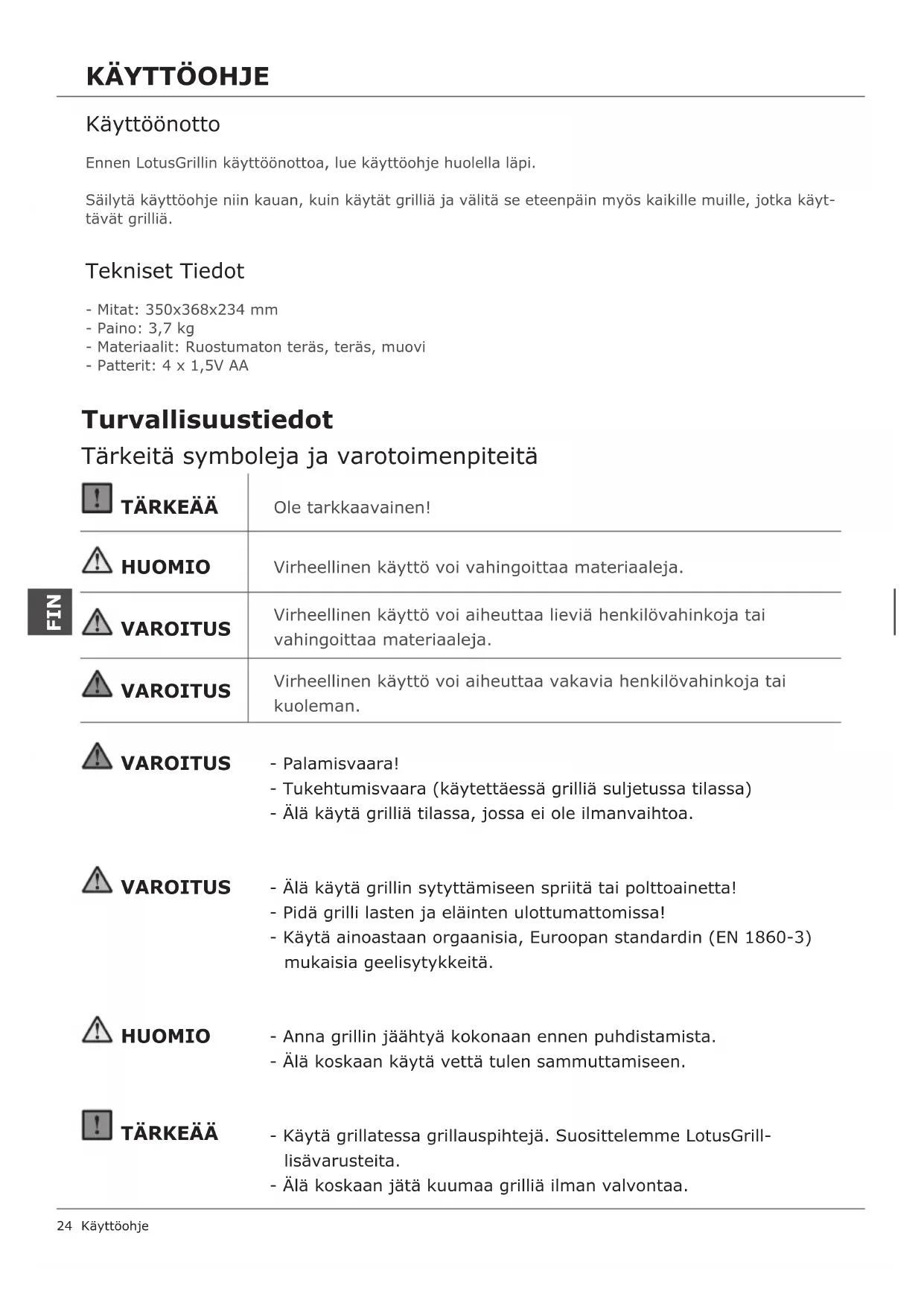 - Se puede utilizar con cualquier tipo de carbón (excepto briquetas)KÄYTTÖOHJE 24 Käyttöohje - Palamisvaara! - Tukehtumisvaara (käytettäessä grilliä suljetussa tilassa) - Älä käytä grilliä tilassa, jossa ei ole ilmanvaihtoa. - Älä käytä grillin sytyttämiseen spriitä tai polttoainetta! - Pidä grilli lasten ja eläinten ulottumattomissa! - Käytä ainoastaan orgaanisia, Euroopan standardin (EN 1860-3) mukaisia geelisytykkeitä. - Anna grillin jäähtyä kokonaan ennen puhdistamista. - Älä koskaan käytä vettä tulen sammuttamiseen. - Käytä grillatessa grillauspihtejä. Suosittelemme LotusGrill- lisävarusteita. - Älä koskaan jätä kuumaa grilliä ilman valvontaa. Ole tarkkaavainen! Virheellinen käyttö voi vahingoittaa materiaaleja. Virheellinen käyttö voi aiheuttaa vakavia henkilövahinkoja tai kuoleman. Virheellinen käyttö voi aiheuttaa lieviä henkilövahinkoja tai vahingoittaa materiaaleja. TÄRKEÄÄ TÄRKEÄÄ HUOMIO HUOMIO VAROITUS VAROITUS VAROITUS VAROITUS Tärkeitä symboleja ja varotoimenpiteitä Turvallisuustiedot FIN Käyttöönotto Ennen LotusGrillin käyttöönottoa, lue käyttöohje huolella läpi.Säilytä käyttöohje niin kauan, kuin käytät grilliä ja välitä se eteenpäin myös kaikille muille, jotka käyt-tävät grilliä. Tekniset Tiedot - Mitat: 350x368x234 mm- Paino: 3,7 kg- Materiaalit: Ruostumaton teräs, teräs, muovi- Patterit: 4 x 1,5V AALotusGrilliä käytetään ruuan valmistukseen hiilillä. Älä käytä grilliä suljetuissa tiloissa, joissa ei ole ilmanvaihtoa. Kaikkia tämän ohjekirjan ohjeita tulee noudattaa. LotusGrilli on tarkoitettu ainoastaan yksityiskäyttöön! Käyttötarkoitus Lue kokoamisohjeet huolella ja noudata turvallisuusohjeita. Varaa kokoamiseen tarpeeksi aikaa ja tilaa. Ota grilli paketista. Kokoaminen: Yleistietoa Pattereiden turvallinen käsittely ja hävittäminen Huomio: Käytä ainoastaan kaupallisesti hyväksyttyjä AA-pattereita. Muista hävittää patterit paikallisten säädösten ohjeistamalla tavalla kuten viemällä ne pattereiden keräyspisteeseen. Pattereita ei saa hävittää talousjätteiden mukana. Suomi 25 Hiilten asianmukainen hävittäminen Tyhjennä hiilet ainoastaan palamattomaan- tai metalliseen astiaan. Älä käytä muovisia tai tulenarkoja astioita. Sähkökäyttöisten osien ympäristöystävällinen hävittäminen Vie vanha grilli sille sopivaan keräyspisteeseen, jonka valmistaja voi sinulle halutessasi neuvoa. Älä hävitä vanhaa grilliä talousjätteiden mukana. Turvallisuustiedot FINLotusGrillillä on kahden vuoden takuu ostopäivästä koskien valmistusvirheitä, edellyttäen, että grillin käytössä on noudatettu annettuja ohjeita. Säilytä ostokuitti takuutodistuksena. Kuitista tulee käydä ilmi ostopäivä. Sellaisten osien hankausjäljet, ruostuminen ja lievä vääntyminen tai tummuminen (erityisesti ruostumattomien teräsosien), jotka ovat suoraan kosketuksissa tuleen eivät ole valmistusvirheitä, vaan normaalia käytöstä johtuvaa kulumista. Hiiliastia on kuluva osa, joka tulisi ajoittain vaihtaa uuteen. Takuu Grillin tulee jäähtyä kokonaan ennen puhdistusta. Älä käytä vettä kuuman grillin jäähdyttämiseen. Tämä saattaa aiheuttaa palovammoja. - Puhdista grillausritilä, sisäkulho sekä muut käytössä likaantuneet osat jokaisen käyttökerran jälkeen. Mahdollisten palovammojen välttämiseksi grillin on annettava jäähtyä kokonaan ennen puhdistusta. - Grillausritilä sekä sisäkulho voidaan pestä astianpesukoneessa tai käsin. - Puhdista elektroniikkayksikön sisältävä ulkoinen kuori ainoastaan pyyhkimällä märällä pyyhkeellä tai harjalla. - Älä käytä puhdistukseen happopitoisia, liuottavia tai muita syttyviä nesteitä. - LotusGrilli tulee säilyttää kuivassa ja lämpimässä tilassa. - Poista patterit mikäli tiedät, että grilli tulee olemaan pois käytöstä pidemmän aikaa. Huolto ja Säilytys Tarkista osaluettelosta ja kuvasta, että kaikki osat ovat mukana: -Irroita grillausritilä ja ota hiiliastia grillin sisältä -Poista pakkausmateriaalit Kokoaminen: Valmistelu Hiiliastian metalliverkon pinnalla saattaa olla valmistusprosessista johtuva ohut öljykalvo. Öljy saattaa aiheuttaa lievää savuamista ensimmäisellä käyttökerralla. Ensimmäinen käyttökerta 26 Käyttöohje TÄRKEÄÄ VAROITUS FINKokoaminen