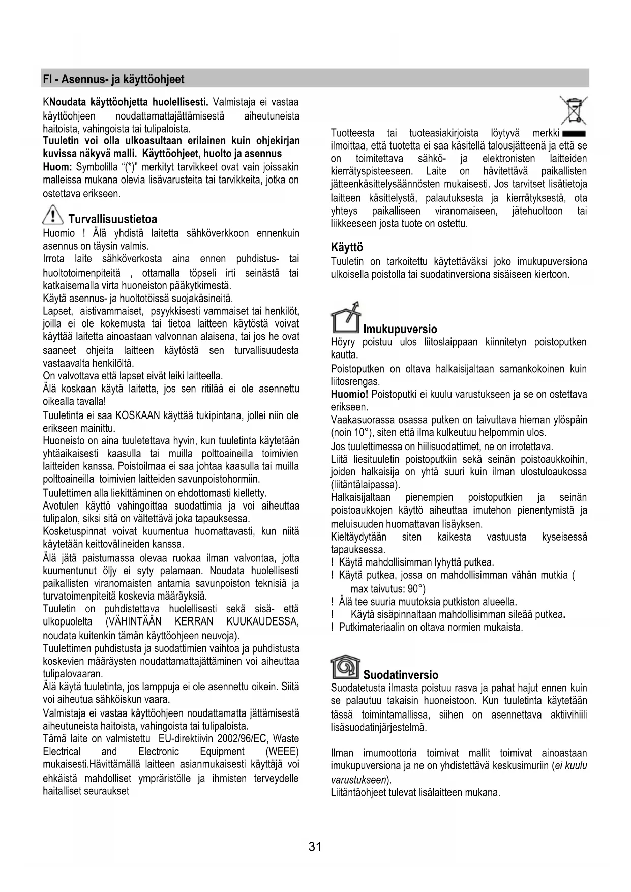 laitteiden kanssa. Poistoilmaa ei saa johtaa kaasulla tai muilla