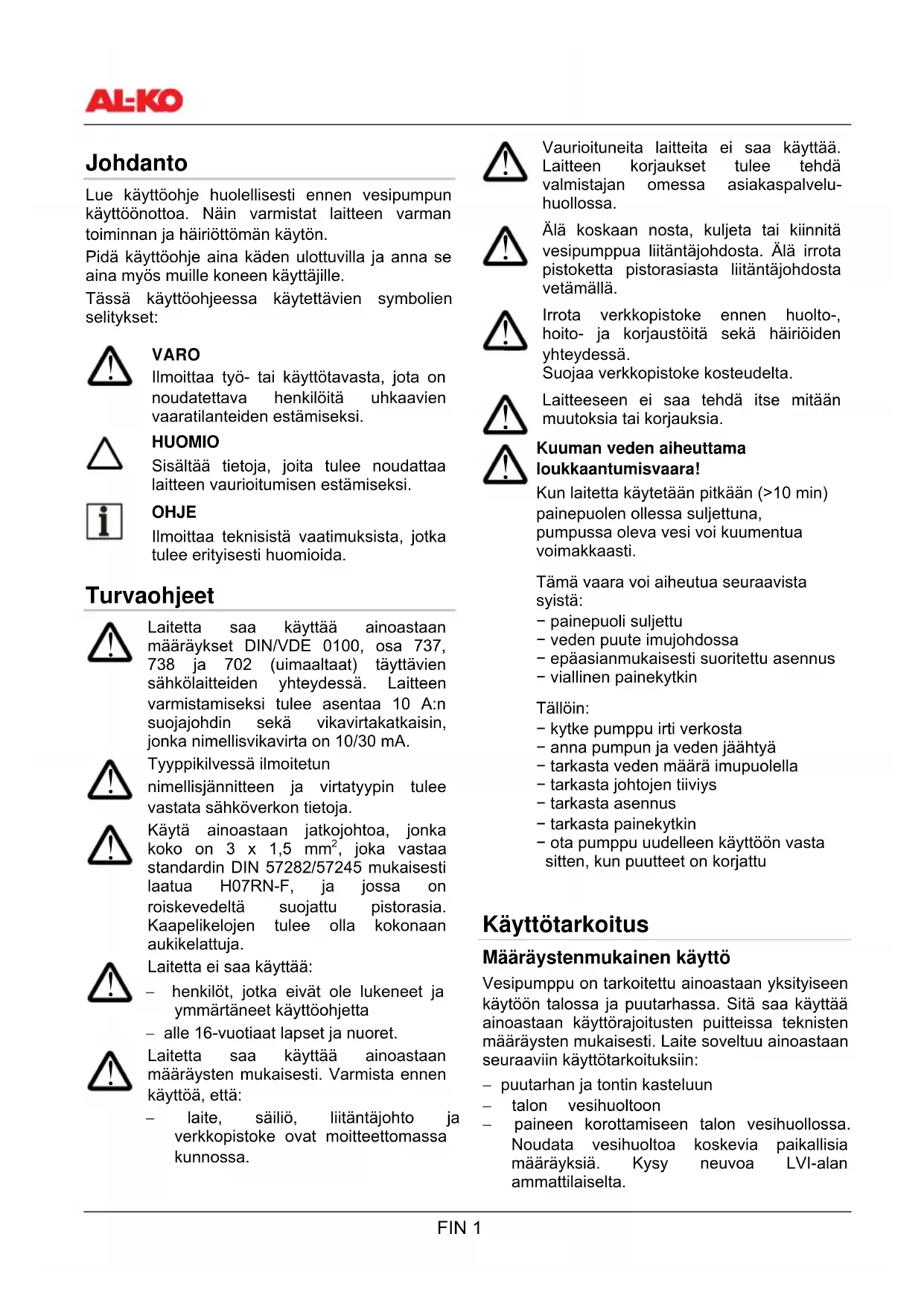 Kuuman veden aiheuttama loukkaantumisvaara! Kun laitetta käytetään pitkään (>10 min) painepuolen ollessa suljettuna, pumpussa oleva vesi voi kuumentua voimakkaasti. Tämä vaara voi aiheutua seuraavista syistä: − painepuoli suljettu − veden puute imujohdossa − epäasianmukaisesti suoritettu asennus − viallinen painekytkin Tällöin: − kytke pumppu irti verkosta − anna pumpun ja veden jäähtyä − tarkasta veden määrä imupuolella − tarkasta johtojen tiiviys − tarkasta asennus − tarkasta painekytkin − ota pumppu uudelleen käyttöön vasta sitten, kun puutteet on korjattu 2BKäyttötarkoitus 11BMääräystenmukainen käyttö Vesipumppu on tarkoitettu ainoastaan yksityiseen käytöön talossa ja puutarhassa. Sitä saa käyttää ainoastaan käyttörajoitusten puitteissa teknisten määräysten mukaisesti. Laite soveltuu ainoastaan seuraaviin käyttötarkoituksiin: − puutarhan ja tontin kasteluun − talon vesihuoltoon − paineen korottamiseen talon vesihuollossa. Noudata vesihuoltoa koskevia paikallisia määräyksiä. Kysy neuvoa LVI-alan ammattilaiselta.FIN 2 Laite soveltuu ainoastaan seuraavien nesteiden johtamiseen: − puhdas vesi − sadevesi 12BMääräystenvastainen käyttö Laitetta ei saa käyttää yhtäjaksoisesti. Laite ei sovellu seuraavien nesteiden johtamiseen: − suolavesi − elintarvikkeet − likavesi, jossa on tekstiilin- tai paperinjäämiä − aggressiiviset aineet, kemikaalit − syövyttävät, syttyvät, räjähtävät tai kaasuuntuvat nesteet − nesteet, joiden lämpötila on yli 35 °C − hiekkapitoinen vesi ja hiovat aineet. 3BLaitekuvaus 13BVesipumppu/tarvikkeet (kuva A ja B) 1 Pumpun sisääntuloaukko/imuletkuliitäntä 2 Täyttöaukon tulppa 3 Pumpun ulostuloaukko/painejohtoliitäntä 4 Moottorikotelo 5 Venttiili 6 Säiliö 7 Manometri 8 Liitäntäjohto 9 Tyhjennysruuvi 10 Painekytkin 11 Tasausjohto 12 Pumppukotelo 13 Esisuodatin (tarvikkeet) 14 AL-KOn imuvarusteet (tarvikkeet) 14BToimituksen sisältö Vesipumpun varusteina on painekytkin, manometri ja verkkojohto sekä maadoitettu pistoke. 15BToiminta Vesipumppu toimii automaattisesti. Pumppu kytkeytyy päälle ja pois paineen mukaan (katso tekniset tiedot). Pumppu imee vettä imujohdon (1) avulla ja johtaa veden säiliöön (6). Kun poiskytkentäpaine saavutetaan (säiliö on täynnä), pumppu kytkeytyy automaattisesti pois päältä. Jos paine alenee n. 2,0 baariin (vettä otetaan pois), pumppu kytkeytyy automaattisesti päälle ja täyttää säiliötä tai johtaa vettä ottopaikkaan. Tässä tapauksessa säiliö täytetään vasta veden oton päättymisen jälkeen. 16BLämpösuojaus Laite on varustettu lämpökytkimellä, joka kytkee pumpun pois päältä sen ylikuumentuessa. Noin 15–20 minuutin jäähdytysvaiheen jälkeen pumppu kytkeytyy jälleen automaattisesti päälle. 4BLaitteen asennus ja käyttöönotto Ennen käyttöönottoa tulee tarkistaa kalvon esipaine säiliön venttiilistä (5). Paineen tulee olla n. 1,5 baaria, korjaa painetta tarvittaessa (katso Kalvon esipaineen korjaus).