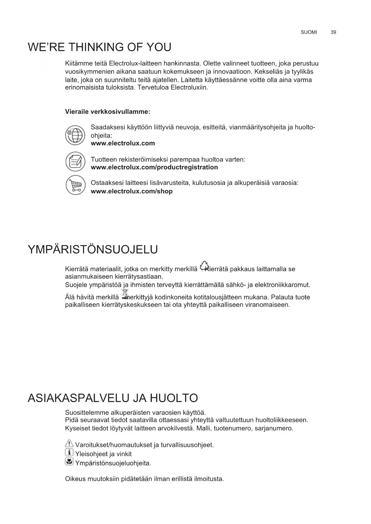 SUOMI WE’RE THINKING OF YOU Kiitämme teitä Electrolux-laitteen hankinnasta. Olette valinneet tuotteen, joka perustuu