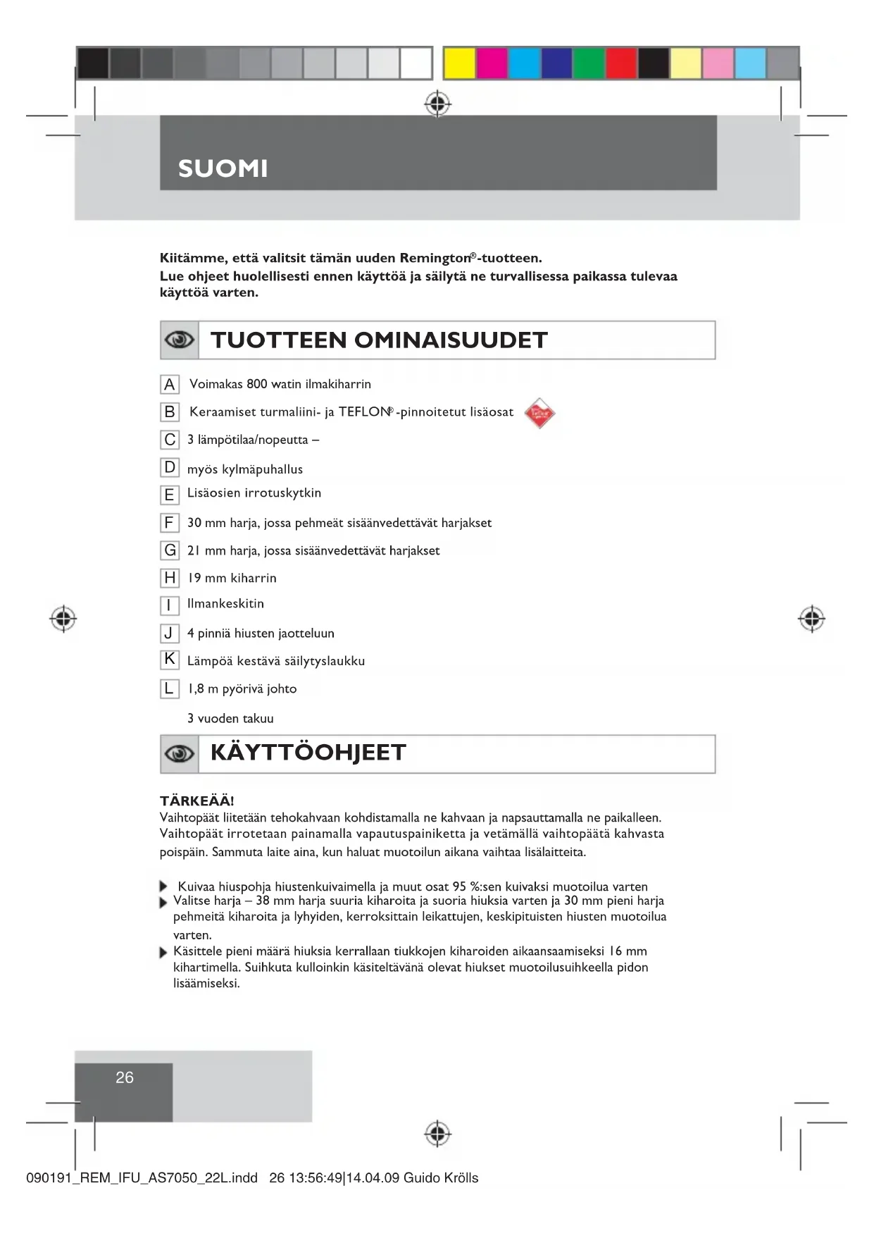 kostutetulla liinalla. Puhdista vaihtopäät irrottamalla ne tehokahvasta. Puhdista pinnat ja harjakset kostealla liinalla ja anna niiden kuivua. Muita puhdistus- tai hoitotoimenpiteitä ei tarvita. VAROTOIMET VAROITUS: TURVALLISUUDEN VUOKSI SUOSITTELEMME JÄÄNNÖSVIRTALAITTEEN KÄYTTÖÄ. KO. LAITTEEN KÄYTTÖVIRRAN EI TULISI YLITTÄÄ 30 mA. LISÄTIETOJA SAAT SÄHKÖASENTAJALTA.KUIVAAJAA EI TULE KÄYTTÄÄ KYLPYAMMEEN, SUIHKUN, LAVUAARIN TAI MUUN VETTÄ TAI MUUTA NESTETTÄ SISÄLTÄVÄN ASTIAN LÄHEISYYDESSÄ.IRROTA LAITE VERKOSTA SILLOIN, KUN SITÄ EI KÄYTETÄ. Älä jätä laitetta ilman valvontaa kun se on päällä. Muotoilulaitteen tulee antaa jäähtyä ennen sen asettamista säilytyslaukkuun. Muotoilulaitetta ei saa upottaa veteen tai muihin nesteisiin. Verkkojohtoa ei saa kiertää laitteen ympärille. Verkkojohdon kunto tulee tarkastaa säännöllisesti. Viallinen johto voi olla hengenvaarallinen. Laitetta käytettäessä on varmistettava, että sen imu- ja poistosäleiköt eivät ole miltään osin tukossa, muuten laite sammuu automaattisesti. Mikäli näin pääsee tapahtumaan, kytke laite pois päältä ja jätä se jäähtymään. Varmista, ettei säleiköissä ole mitään tukkeita, esim. nukkaa, hiuksia jne. Älä aseta laitetta pehmeälle alustalle kuten matolle, vuodevaatteille tai pyyheliinalle. Älä jätä laitetta päälle, kun lasket laitteen pois kädestäsi. Varmista, että käyttöjännite on sama kuin laitteeseen merkitty jännite. Älä ohjaa ilmavirtaa kohti silmiä tai muita herkkiä ruumiinosia. Pidä laite poissa lasten ulottuvilta. Voi olla myös vaarallista antaa laite henkilöille, jotka ovat fyysisesti, sielullisesti tai henkisesti vammaisia tai joilla ei ole tarpeeksi kokemuksia ja tietoja laitteen käytöstä. Heistä vastuussa olevien henkilöiden on annettava varmat ohjeet tai heidän on valvottava laitteen käyttöä. Tämän hiusmuotoilulaitteen kanssa ei saa käyttää muita kuin Remington ® -lisälaitteita. Vältä koskettamasta laitteella kasvoja, kaulaa ja päänahkaa. Tätä laitetta ei ole tarkoitettu ammattikäyttöön.090191_REM_IFU_AS7050_22L.indd 27 13:56:50|14.04.09 Guido KröllsSUOMI