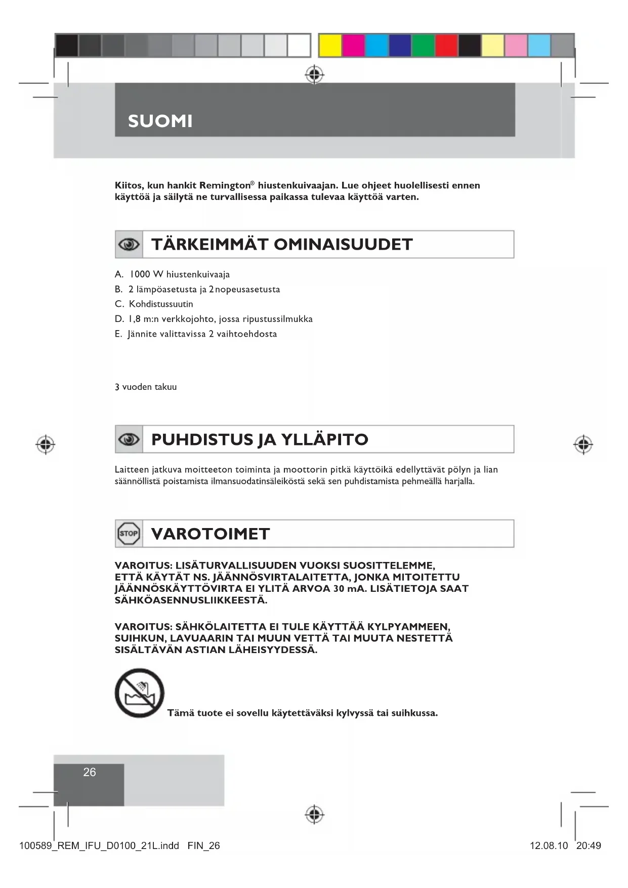 D0100 - Hiustenkuivain REMINGTON - Notice d'utilisation et mode d'emploi gratuit