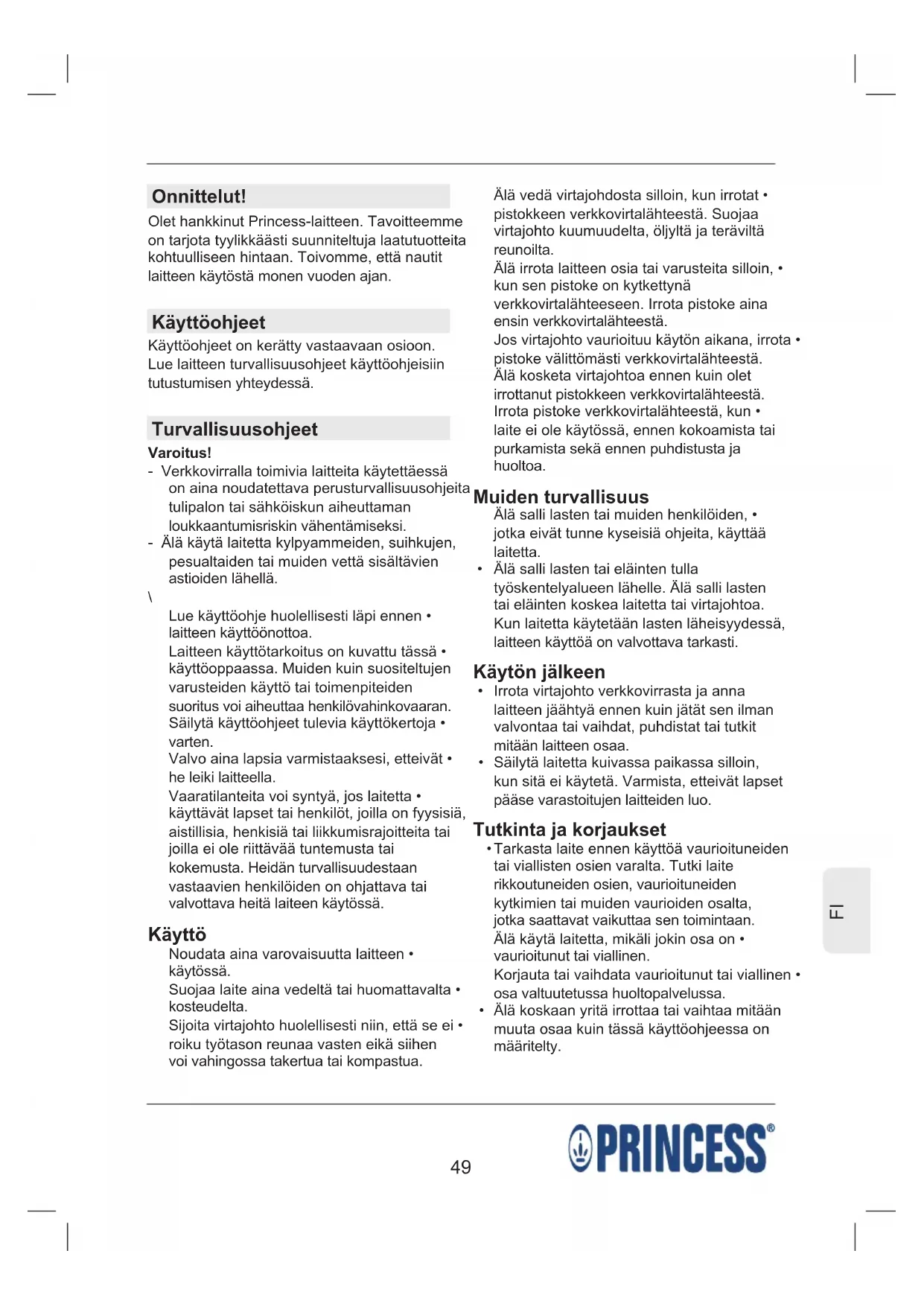 Onnittelut! Olet hankkinut Princess-laitteen. Tavoitteemme on tarjota tyylikkäästi suunniteltuja laatutuotteita kohtuulliseen hintaan. Toivomme, että nautit laitteen käytöstä monen vuoden ajan. Käyttöohjeet Käyttöohjeet on kerätty vastaavaan osioon. Lue laitteen turvallisuusohjeet käyttöohjeisiin tutustumisen yhteydessä. Turvallisuusohjeet Varoitus! - Verkkovirralla toimivia laitteita käytettäessä on aina noudatettava perusturvallisuusohjeita tulipalon tai sähköiskun aiheuttaman loukkaantumisriskin vähentämiseksi. - Älä käytä laitetta kylpyammeiden, suihkujen, pesualtaiden tai muiden vettä sisältävien astioiden lähellä.